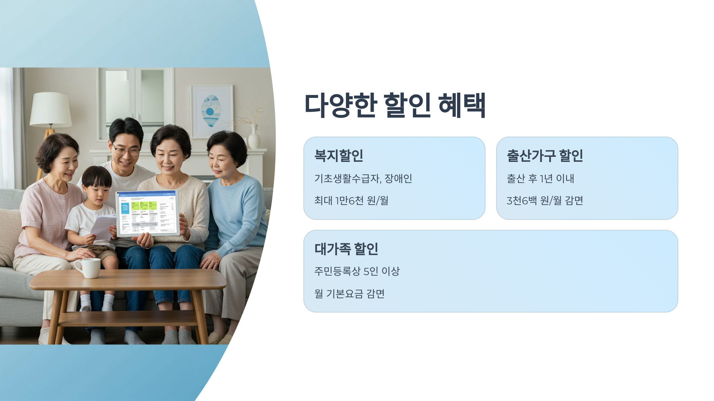 | 복지할인 | 기초생활수급자, 장애인 등 | 최대 1만6천 원/월 |