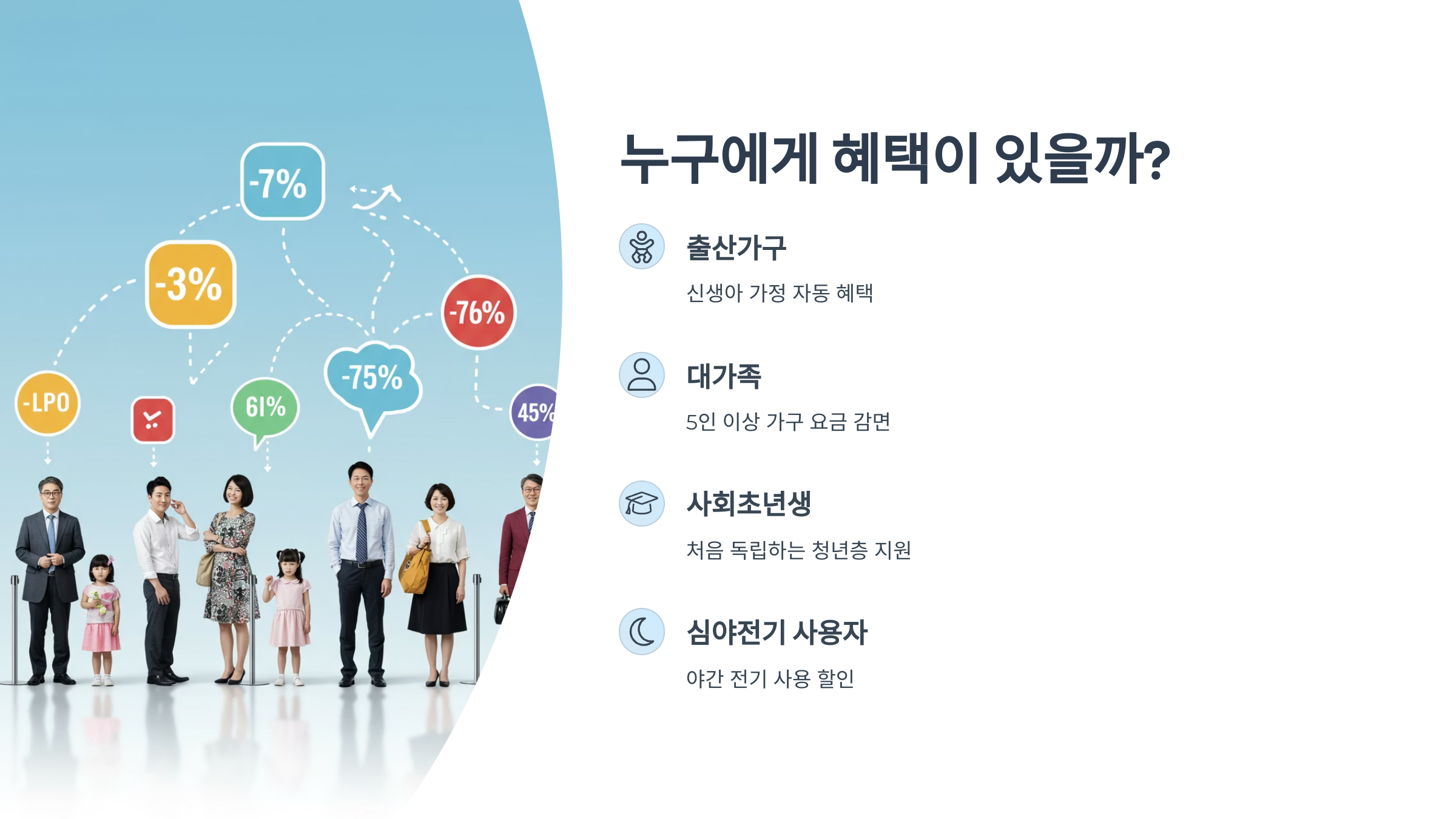 출산가구, 대가족, 사회초년생, 심야전기 사용자 등을 위한 다양한 할인 항목이 있으며,