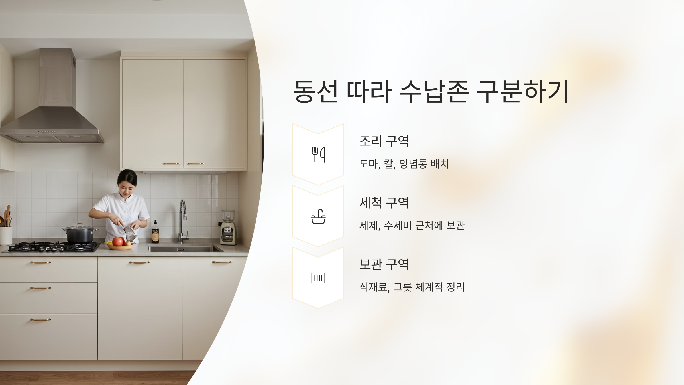 조리, 세척, 보관 등 주요 동선에 따라 물건을 구분해보세요.