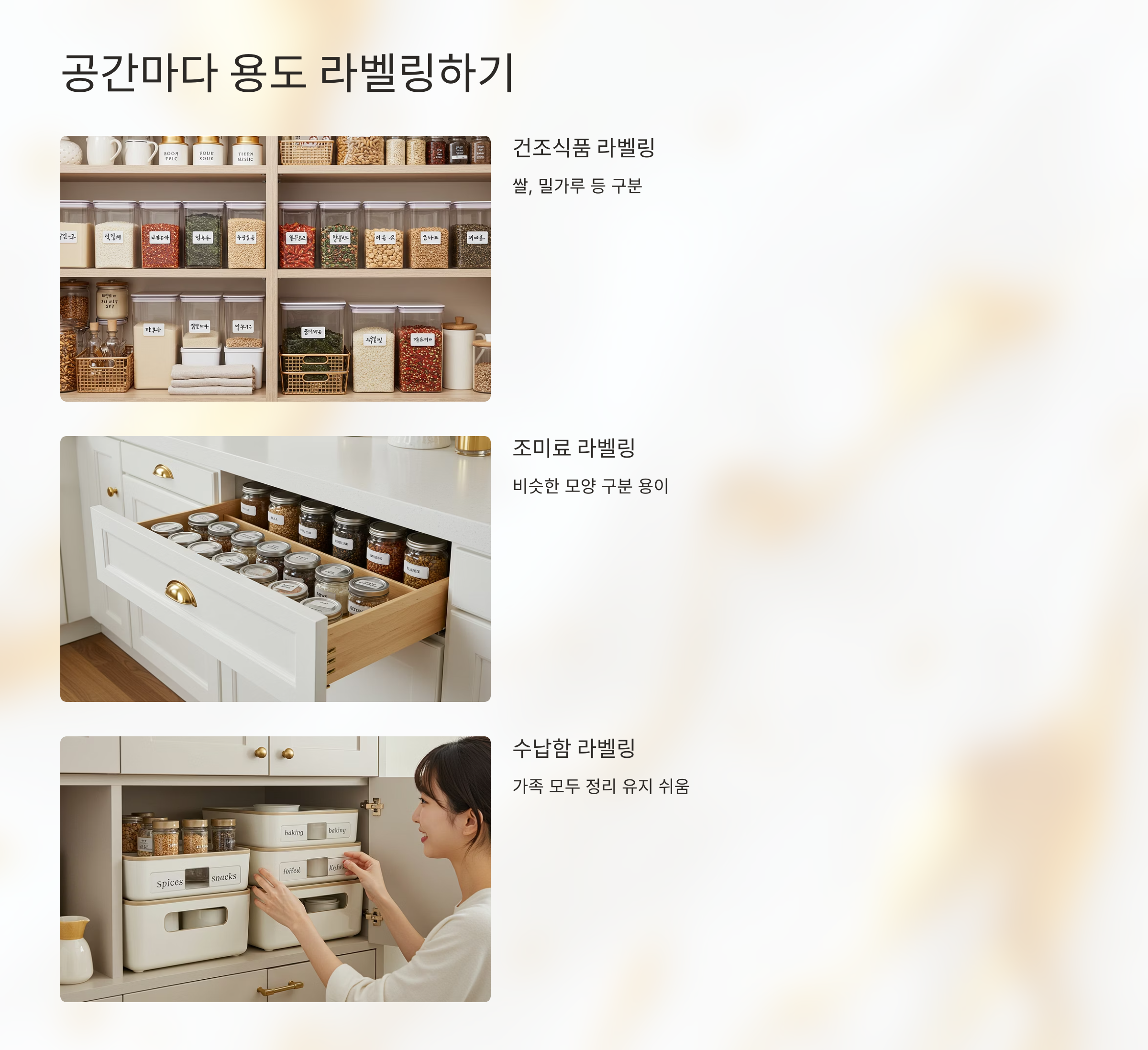 예를 들어, 조리도구 / 양념류 / 밀폐용기 등