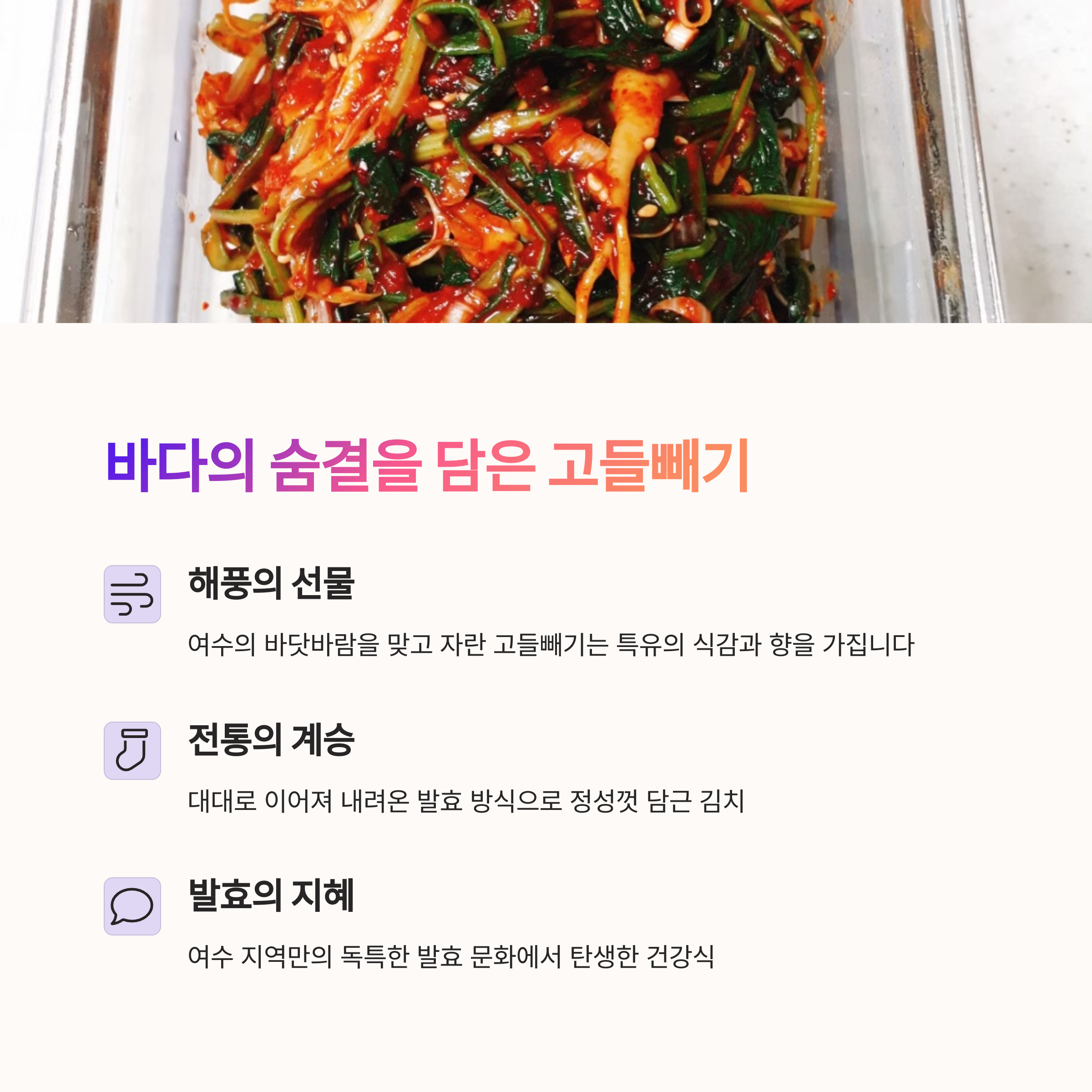 | 여수 고들빼기의 특징 | 여수 지역 특유의 해풍과 토양에서 자라 깊은 풍미가 납니다. |