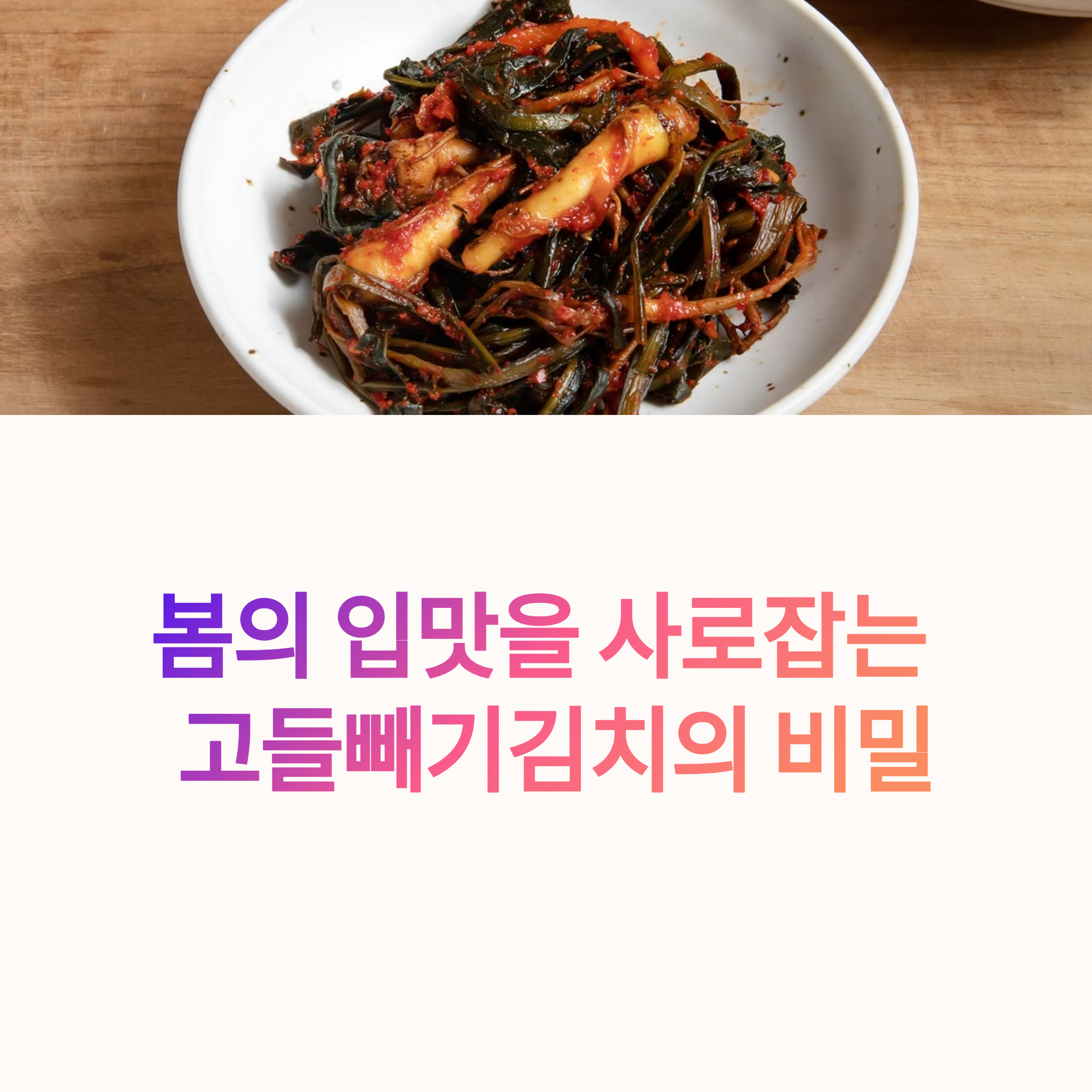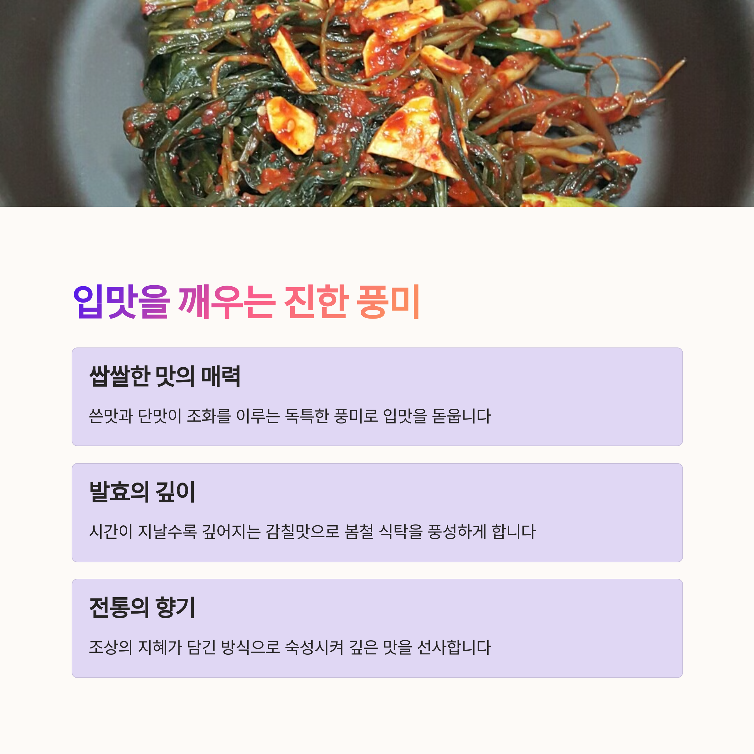 | 쌉싸름한 맛이 입맛을 돋우는 봄철 대표 김치 | 밥 한 공기 뚝딱 비우게 만드는 별미 반찬 | 봄철 환절기에 가족 건강 챙기는 최적의 식재료 |