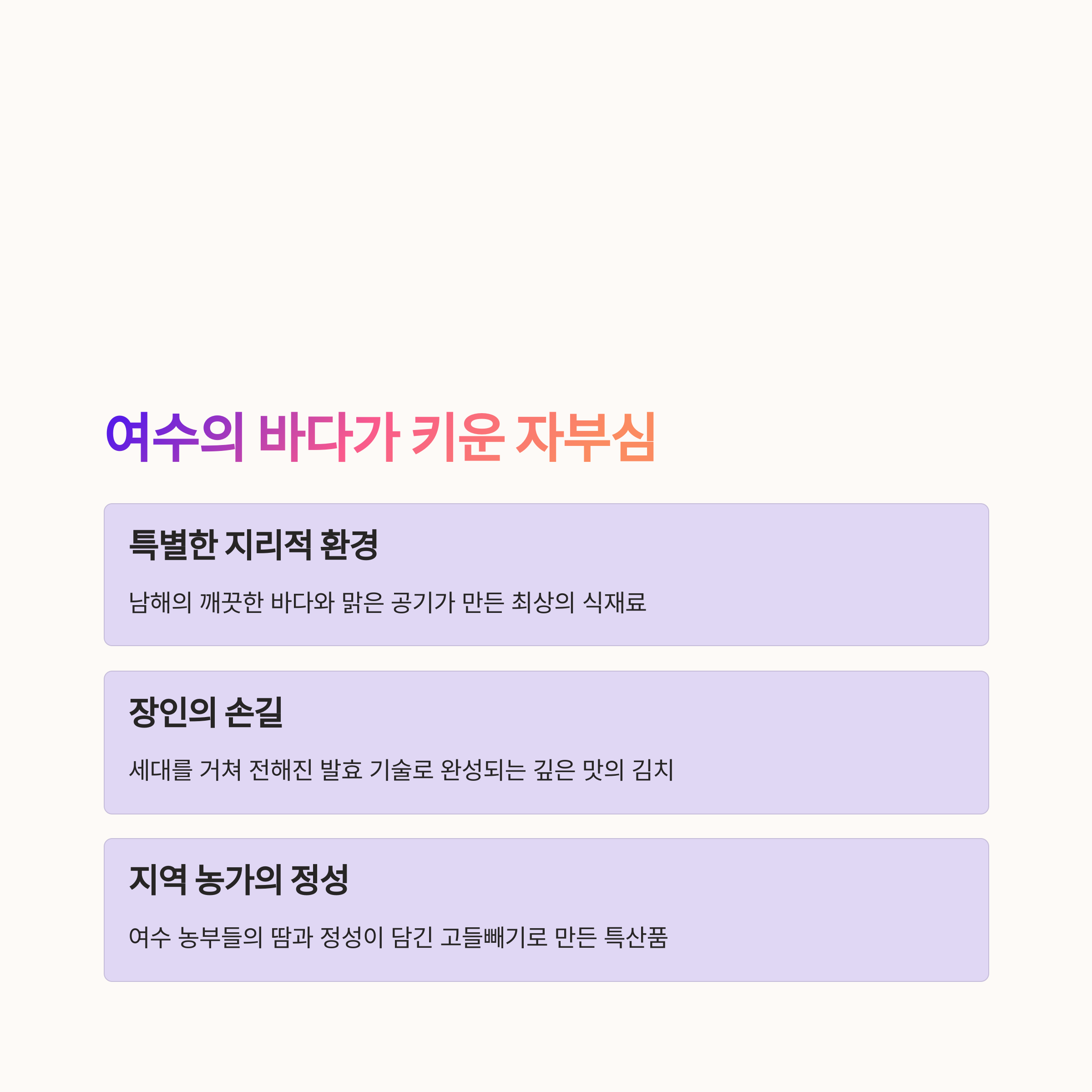 | 발효식품 특유의 감칠맛과 건강함이 조화를 이룹니다. | 지역 특산품으로 여수의 맛을 그대로 담았습니다. | 면역력 강화에 도움을 주는 자연 발효 건강식입니다. |