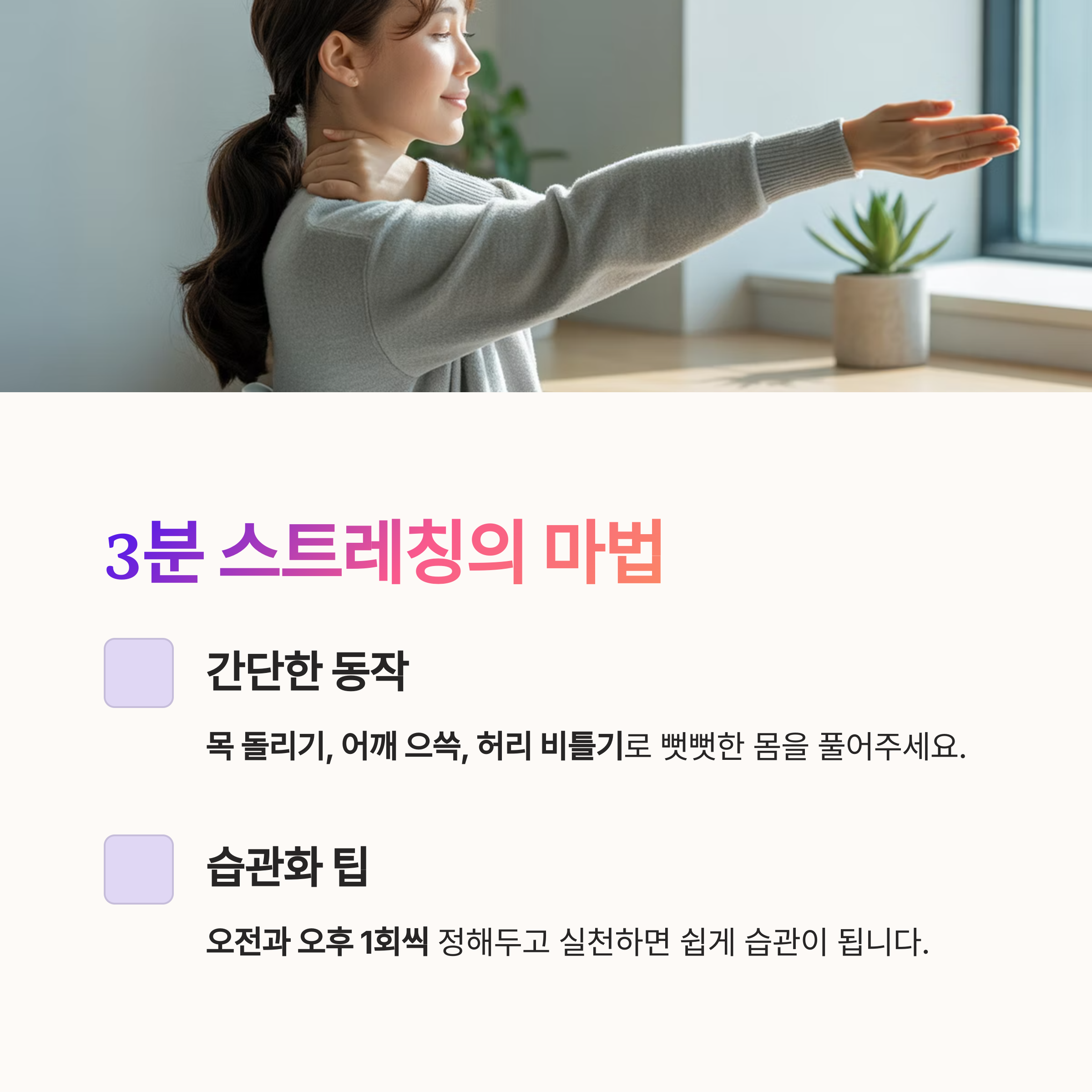 | 스트레칭 | 3분 | 유연성, 혈액순환 개선 |
