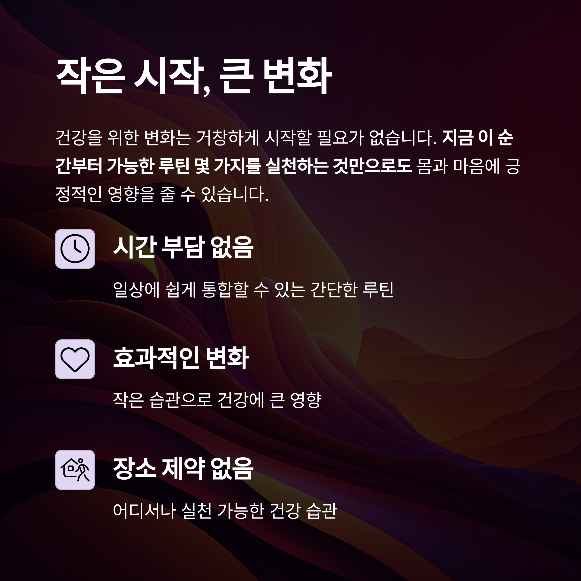지금 당장 시작할 수 있는 간단하고 효과적인 건강 루틴 다섯 가지를 소개합니다.
