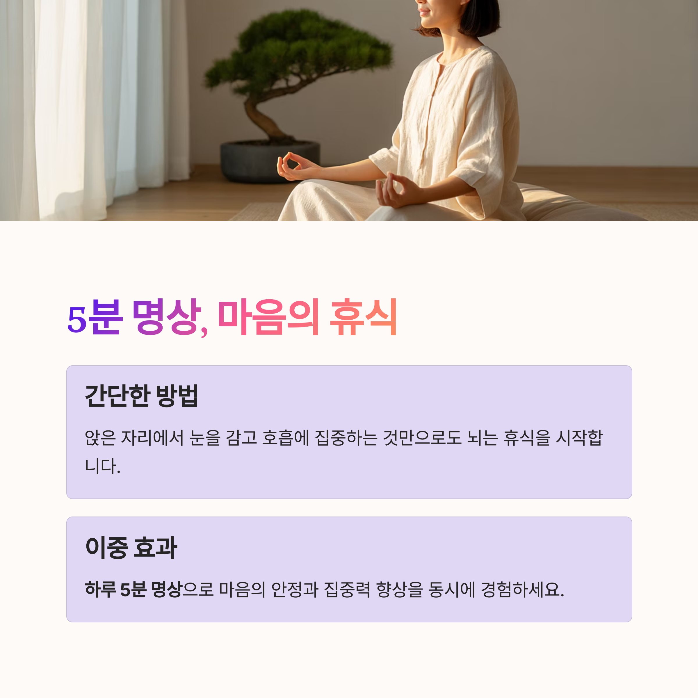 | 명상 | 하루 5분 | 집중력, 마음 안정 |