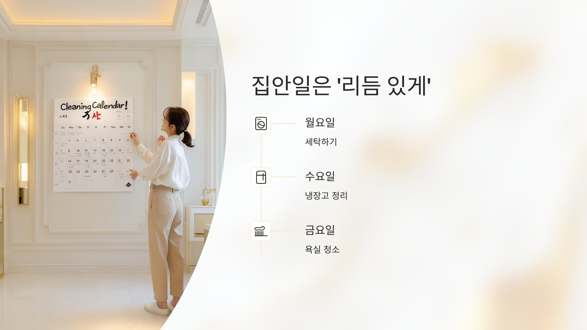월요일에는 세탁, 수요일은 냉장고 정리, 금요일은 욕실 등