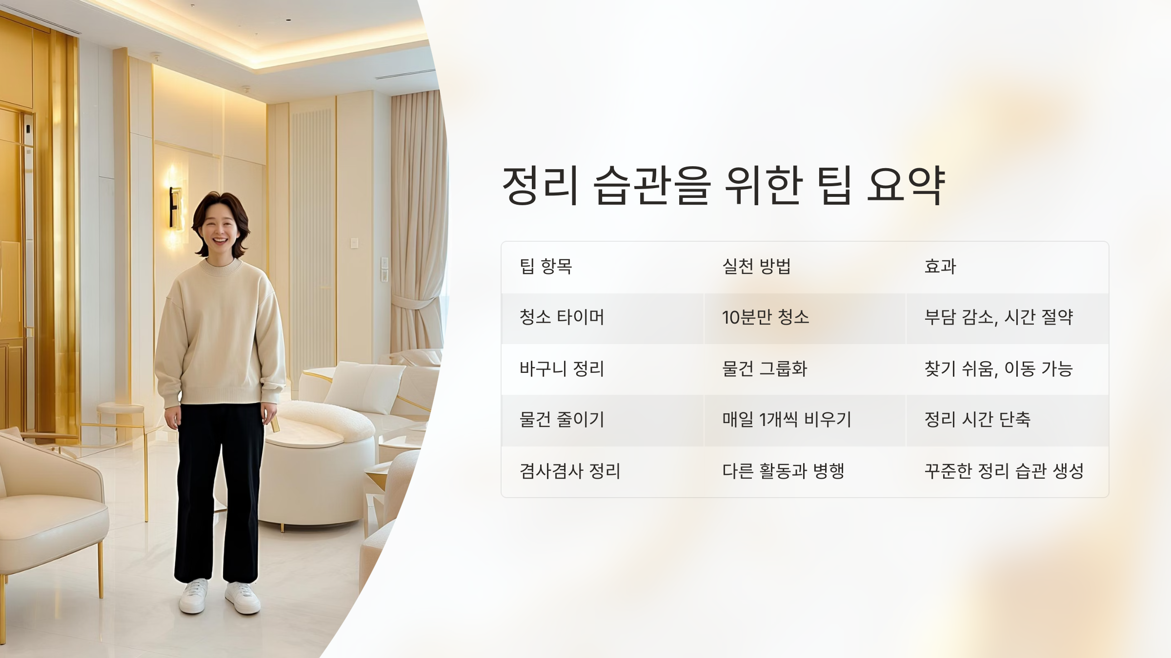 | 물건 줄이기 | 매일 1개씩 비우기 | 정리 시간 단축 |