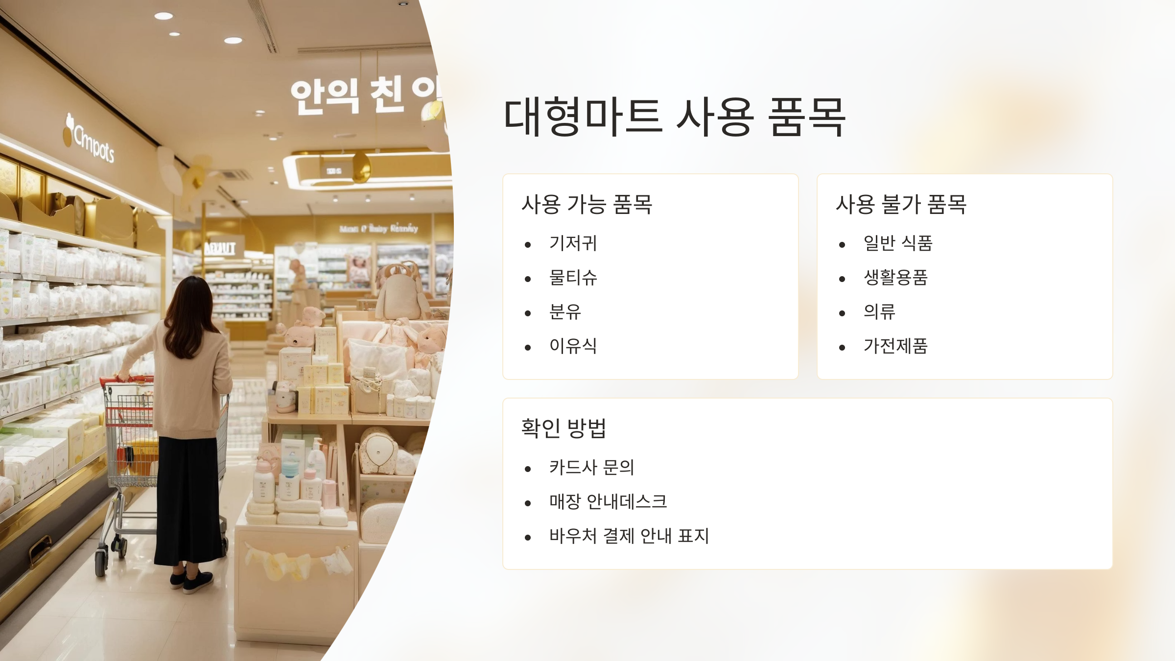 첫만남이용권은 대형마트에서도 전부 사용 가능한 것이 아니라,
