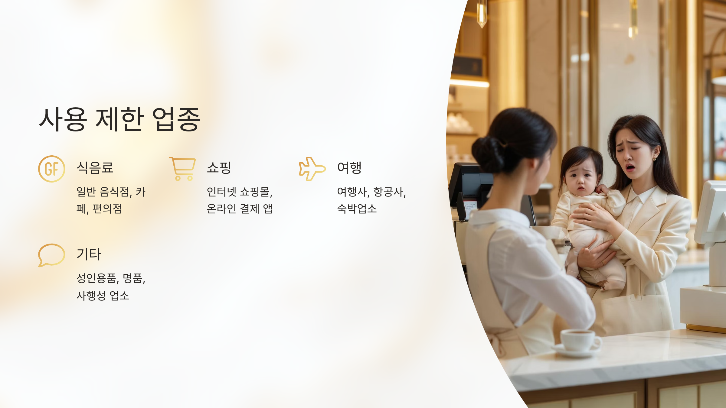 유흥, 기호, 사치 업종 등에서는 사용이 차단되어 있습니다.