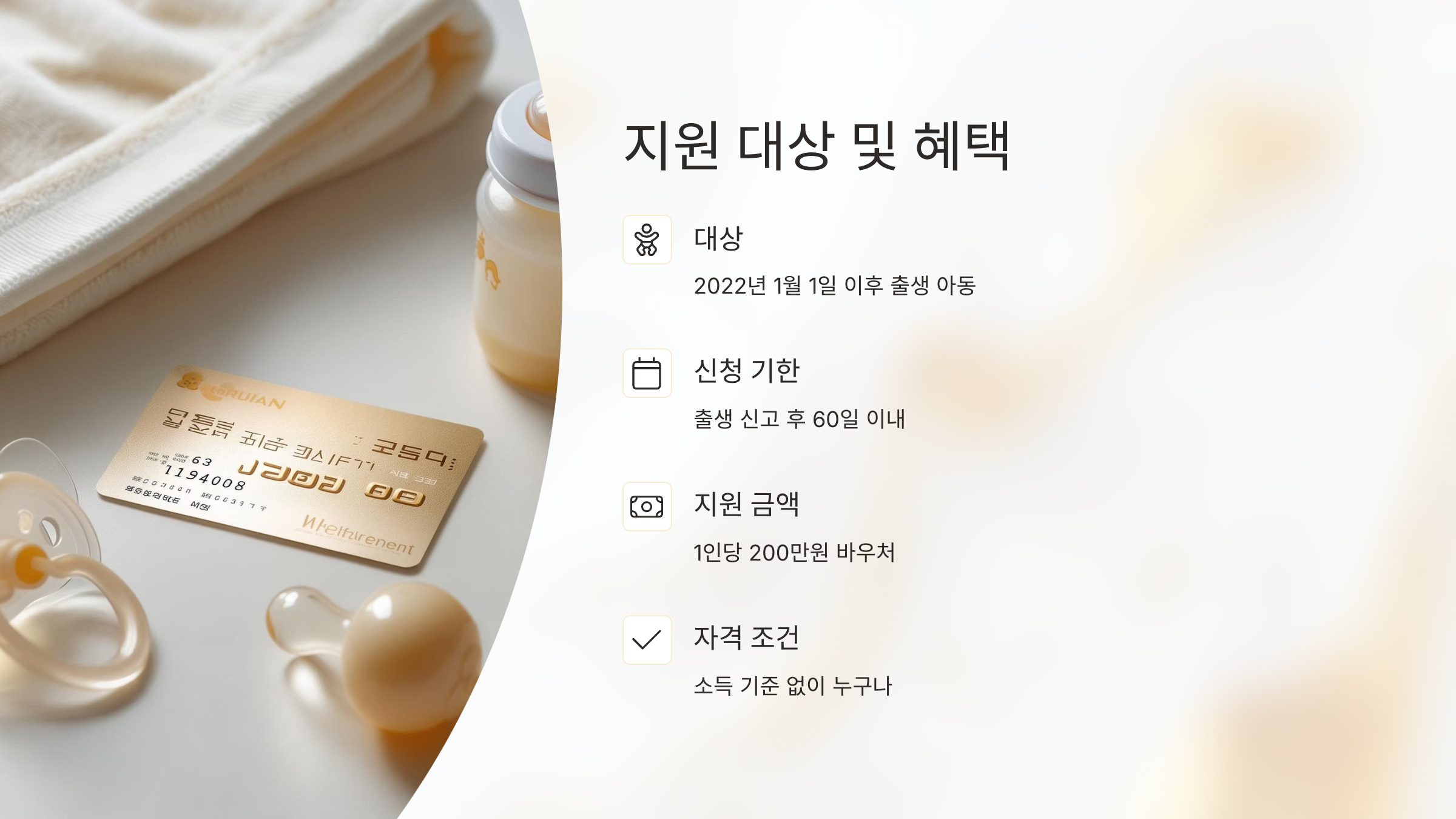 첫만남이용권은 2022년 이후 출생한 모든 신생아에게 1인당 200만원 상당의 바우처를 지원하는 제도입니다.