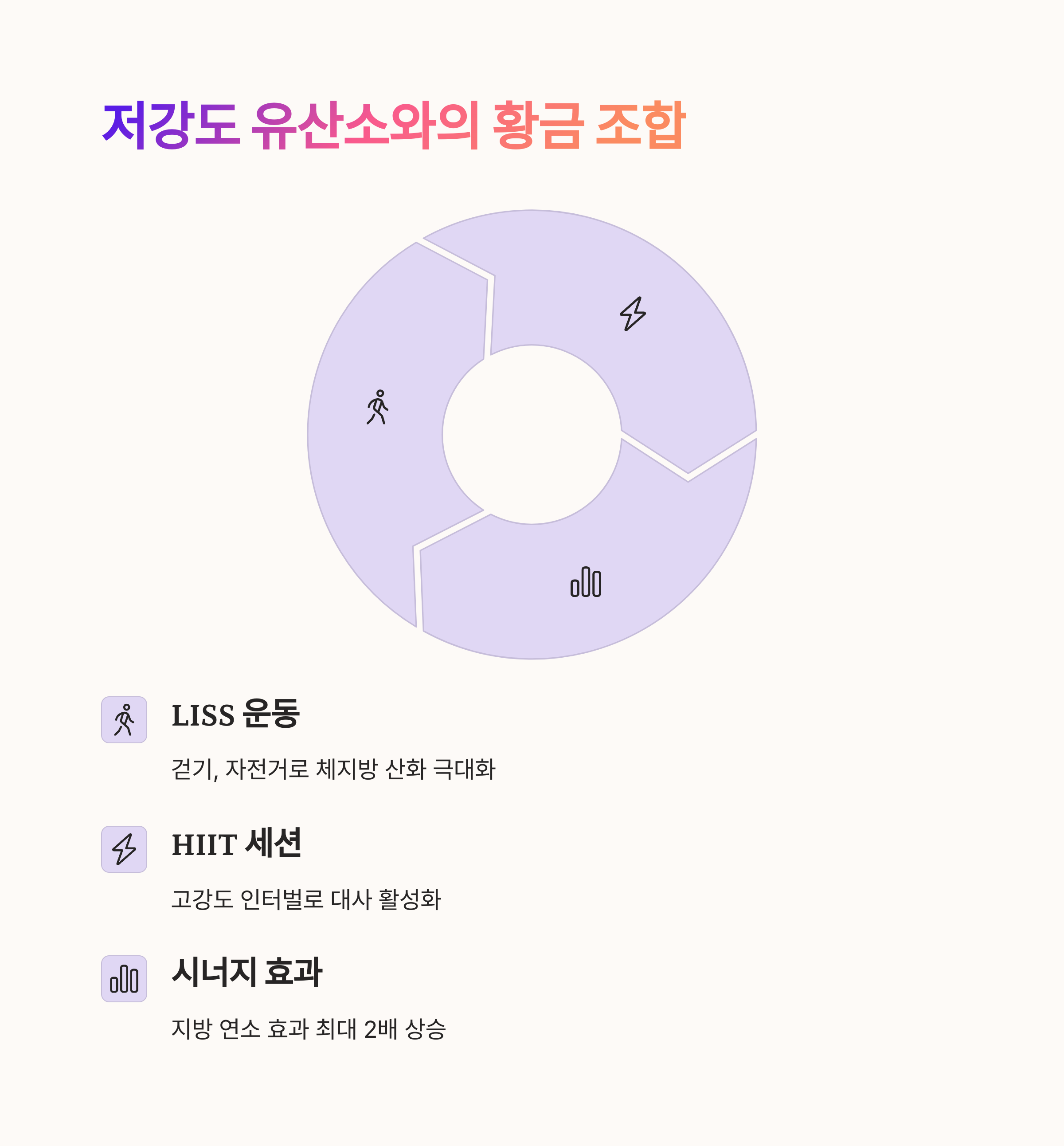 | 걷기, 달리기, 사이클 등 꾸준한 움직임 중심 | 고강도 운동과 회복운동 반복 방식 | 유산소와 근력운동을 혼합한 루틴 구성 |