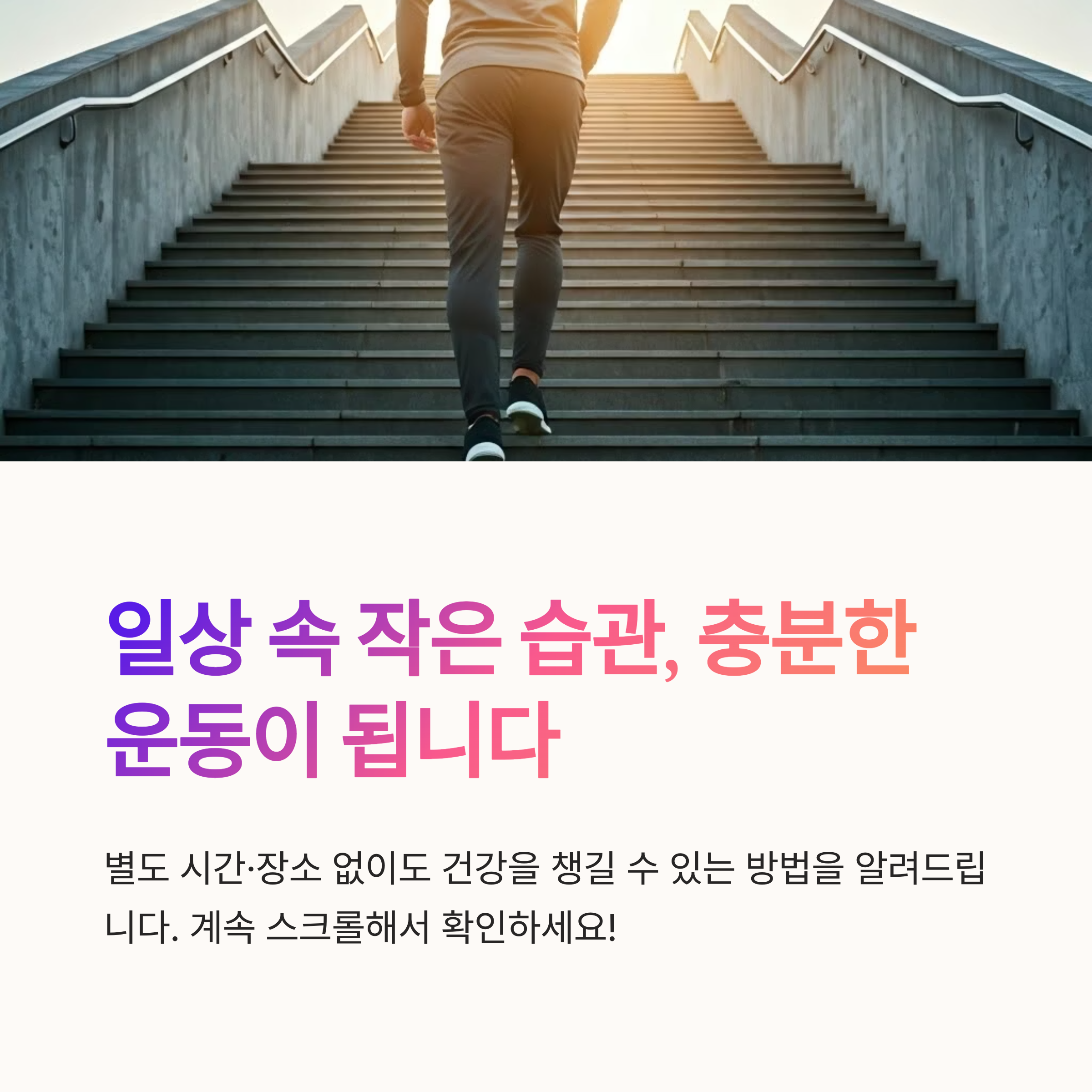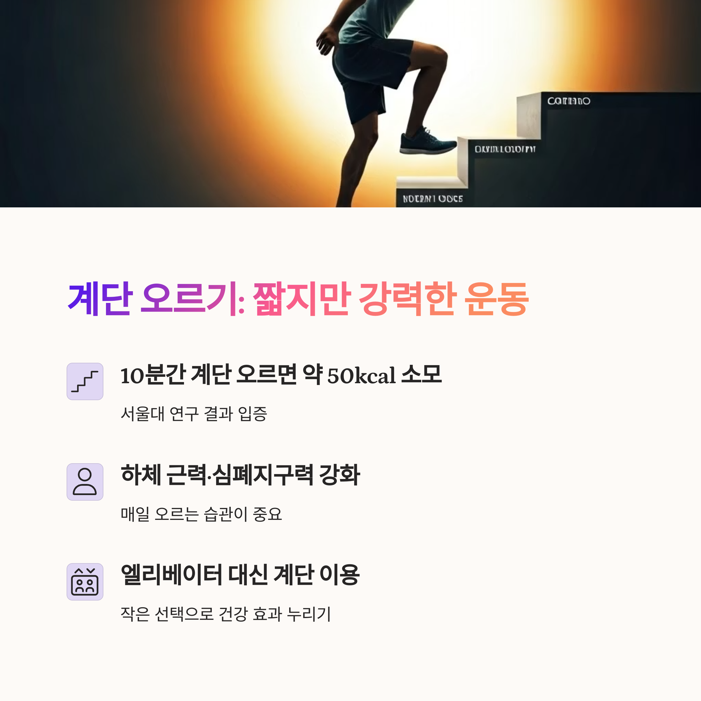 | 계단 오르기와 걷기로 자연스러운 소비 증가 | 일상 속에서 꾸준히 실천 가능한 운동법 | 식사 조절과 함께 병행 시 더 큰 효과 |