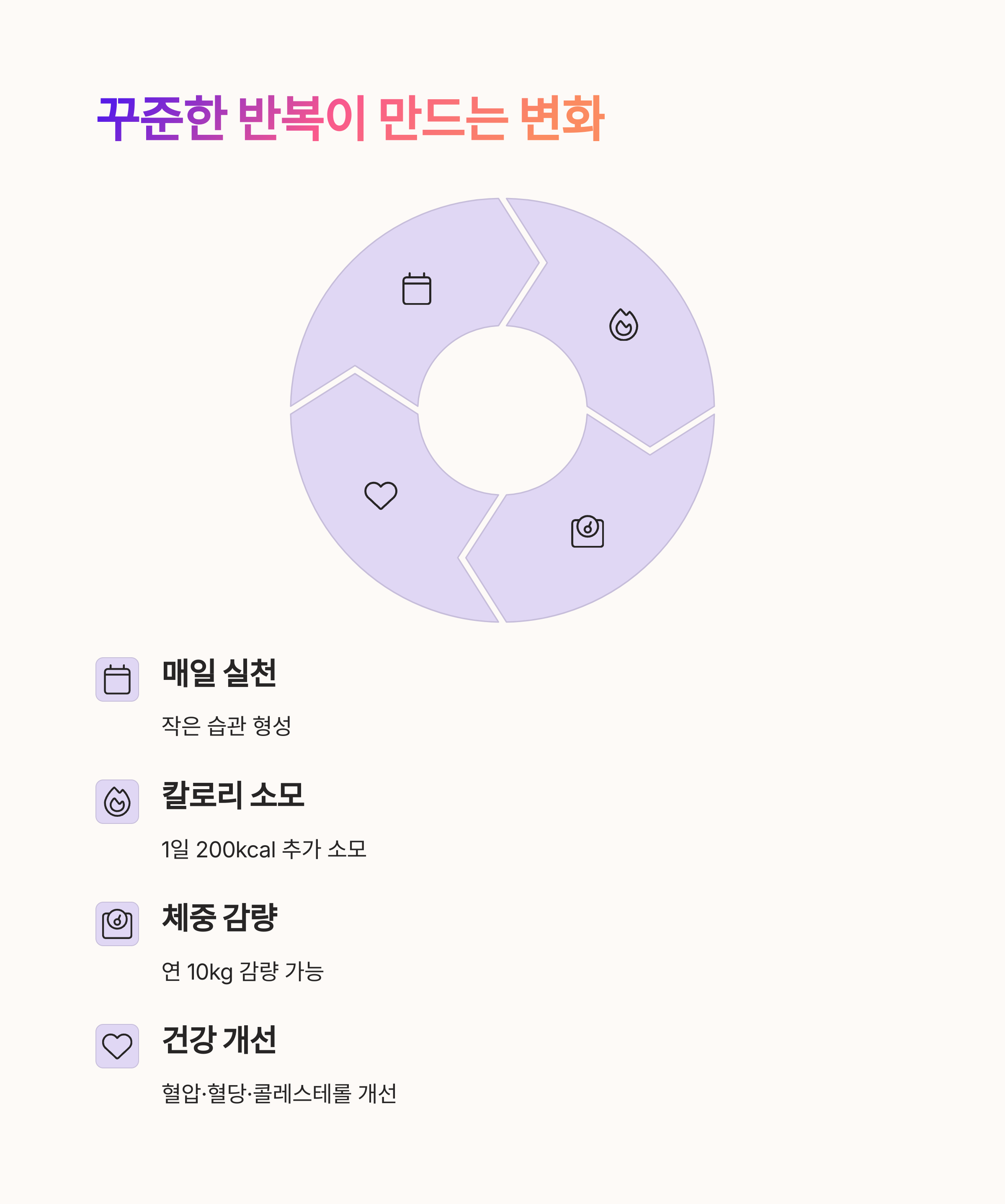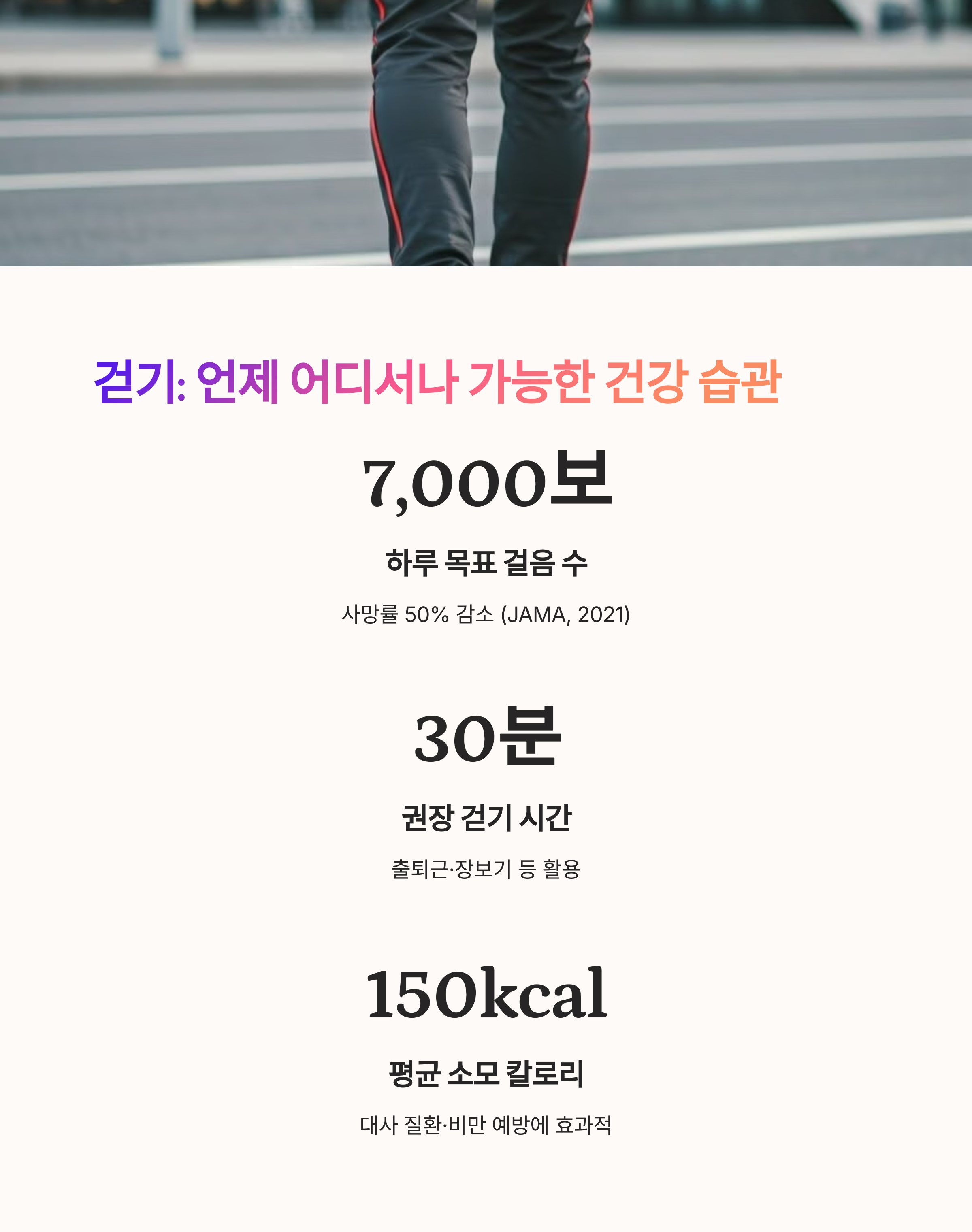| 걷기 습관 | 가까운 거리는 걸어서 이동하며 활동량을 늘려요. |