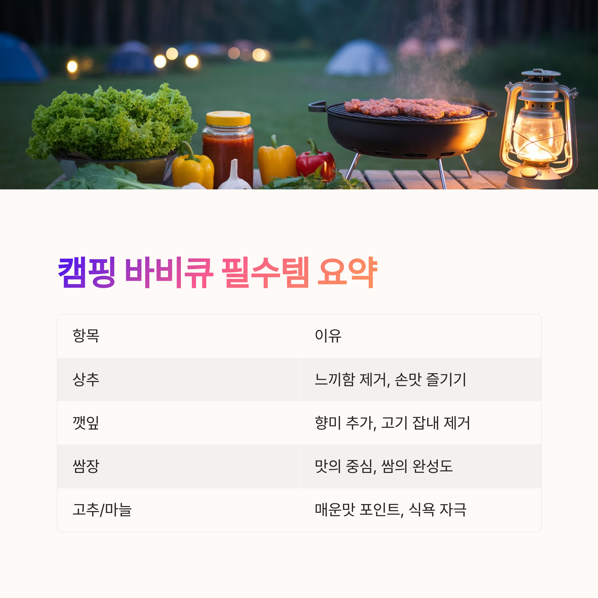 캠핑 바비큐 필수템 요약표