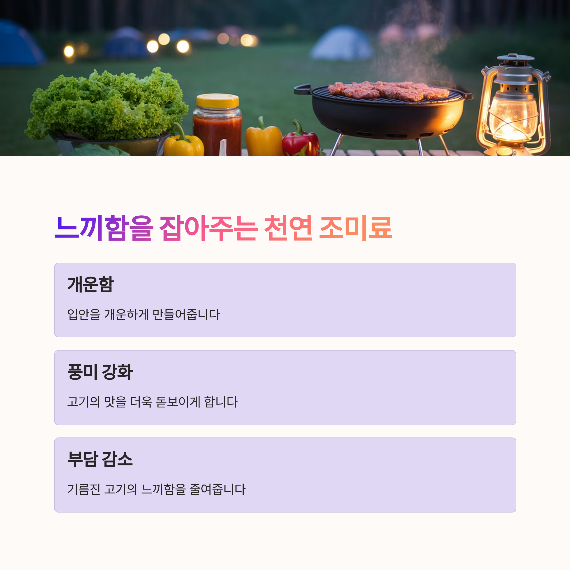 고기의 풍미를 살리면서도 부담을 줄여주는 천연 조미료 역할을 합니다.