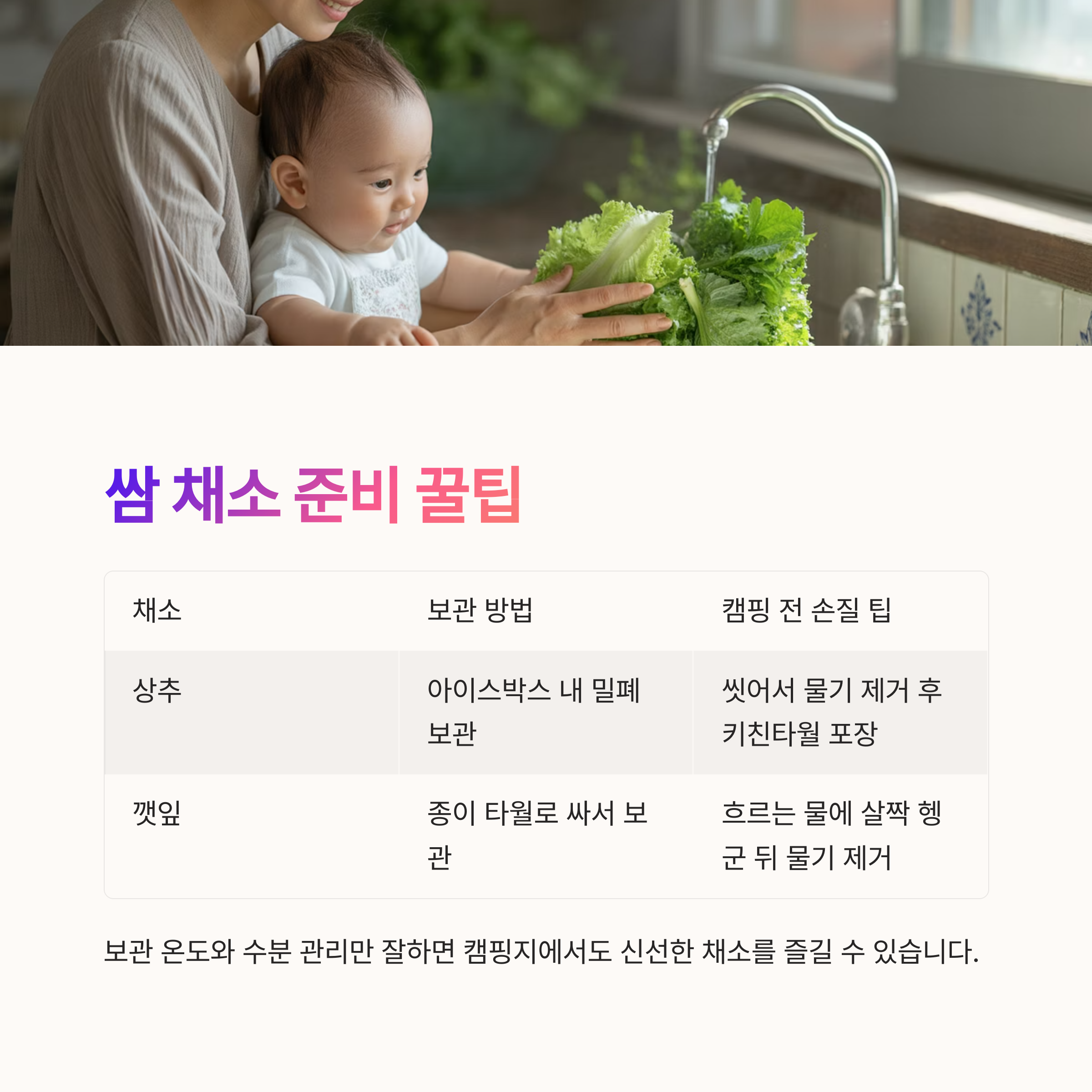 보관 온도와 수분 관리만 잘하면 캠핑지에서도 신선한 채소를 즐길 수 있습니다.