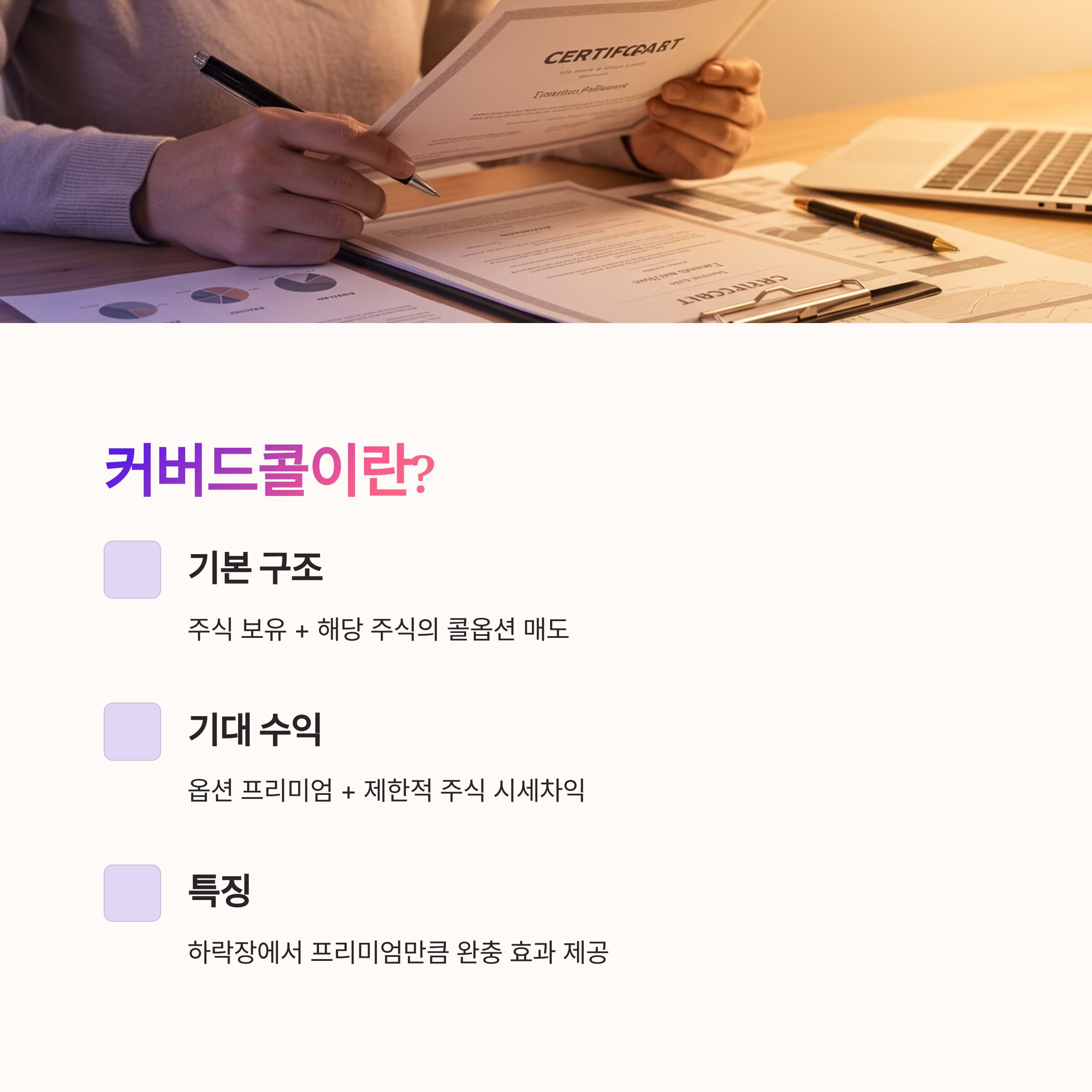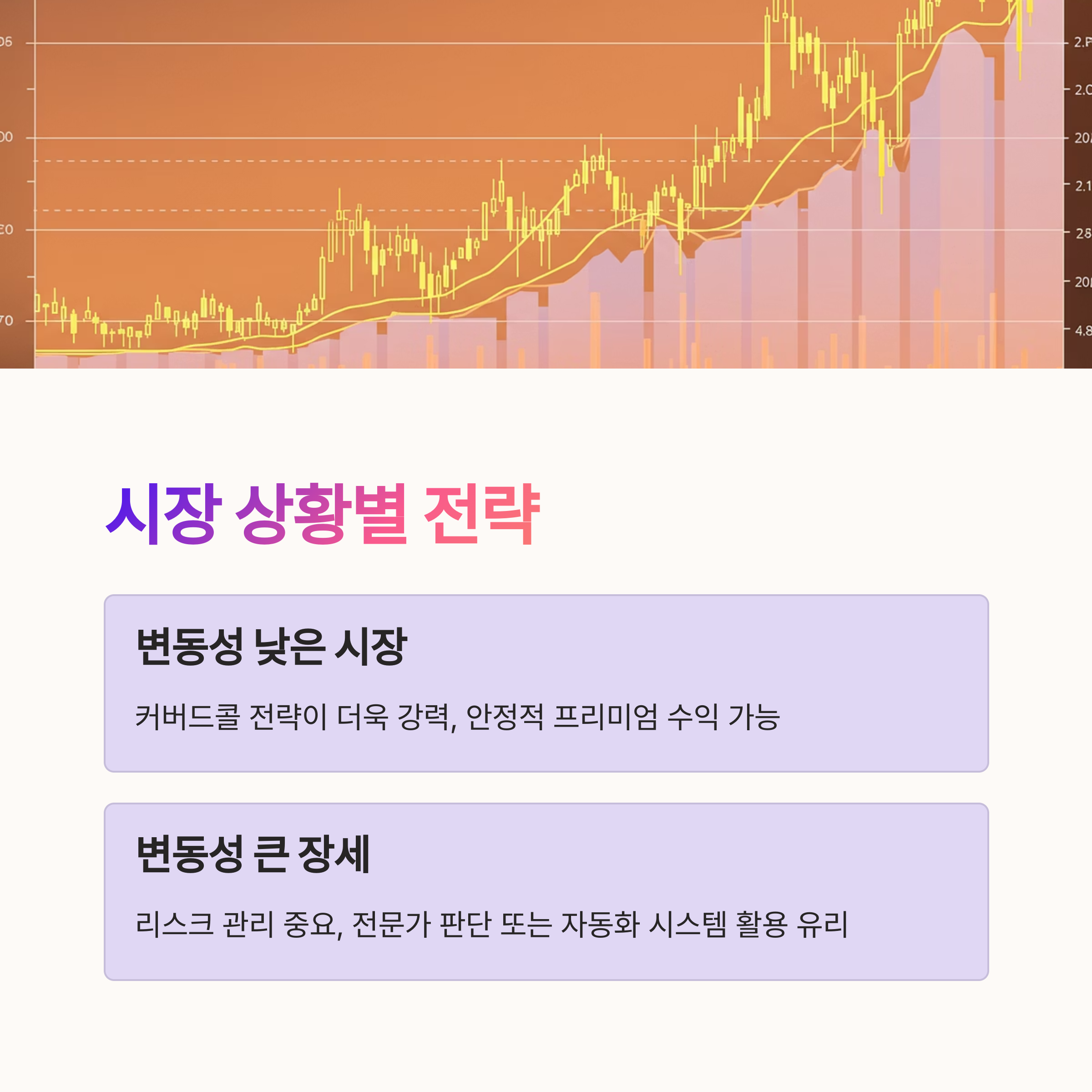 | 주가 상승 시 | 주가 상승 + 옵션 프리미엄 (단, 상한선 존재) | 주가 상승폭 제한 |