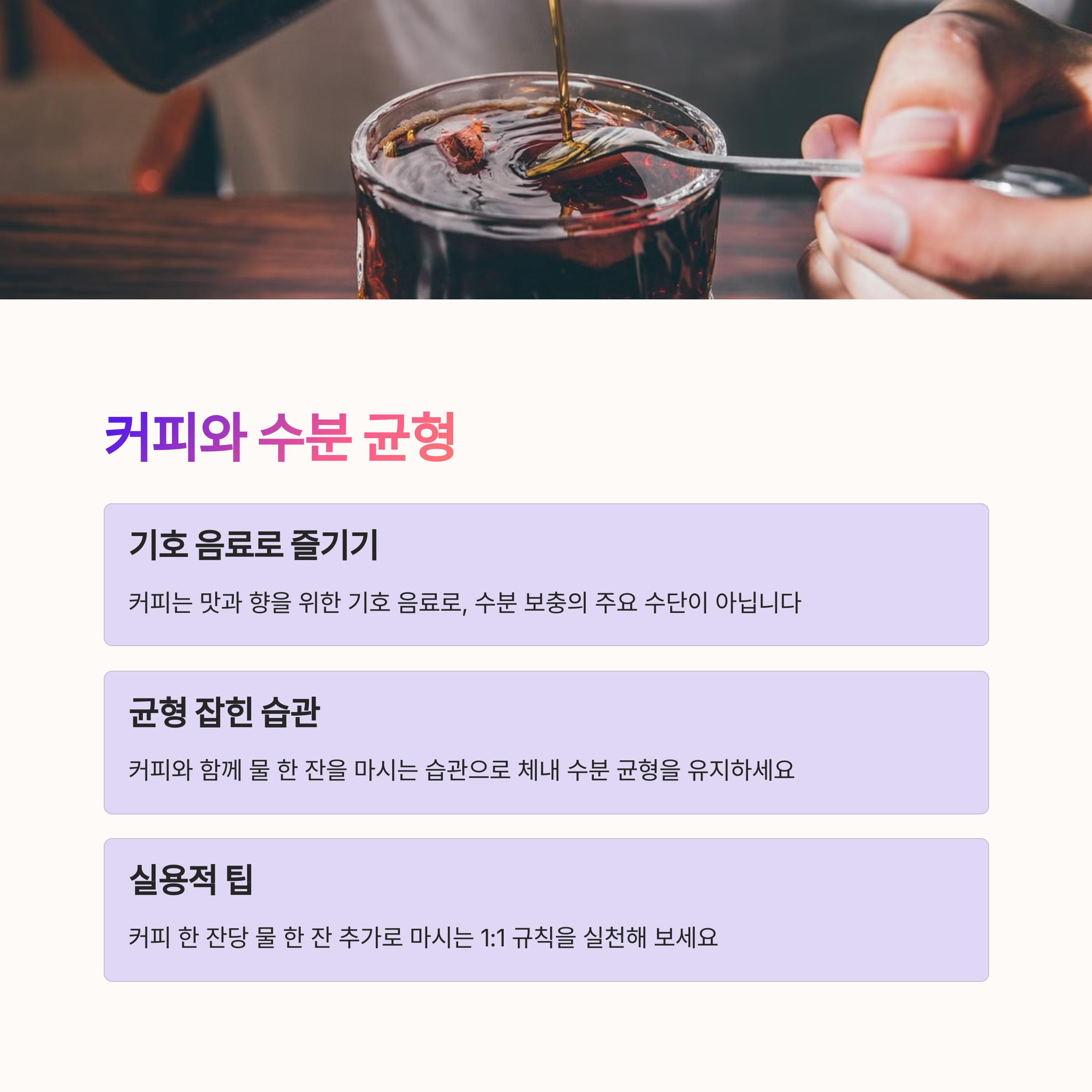 | 커피의 수분 보충 효과 | 커피도 수분 공급은 되지만 한계가 있어요. |