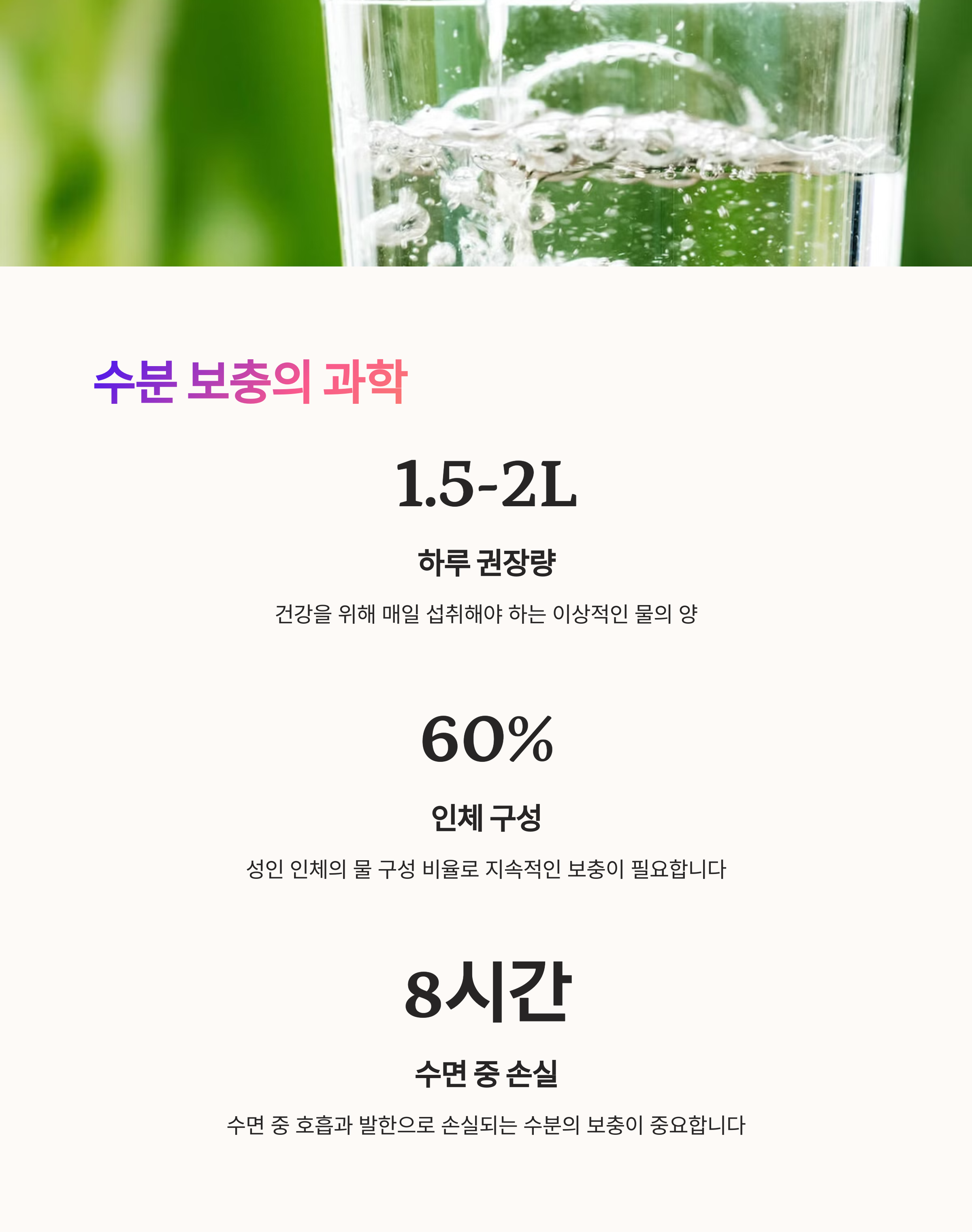| 하루 적정 수분량 | 하루 1.5~2리터 물 섭취가 가장 이상적입니다. |