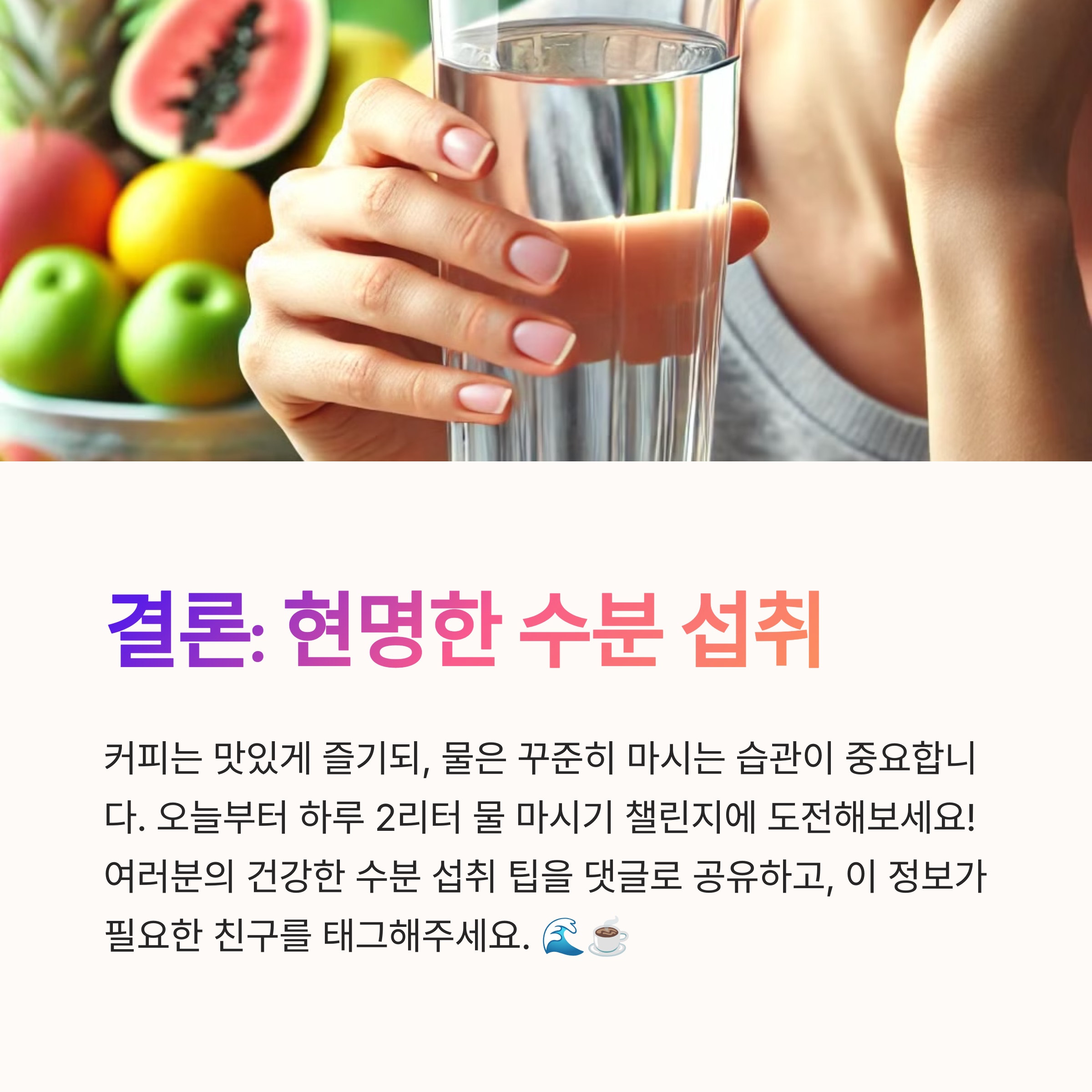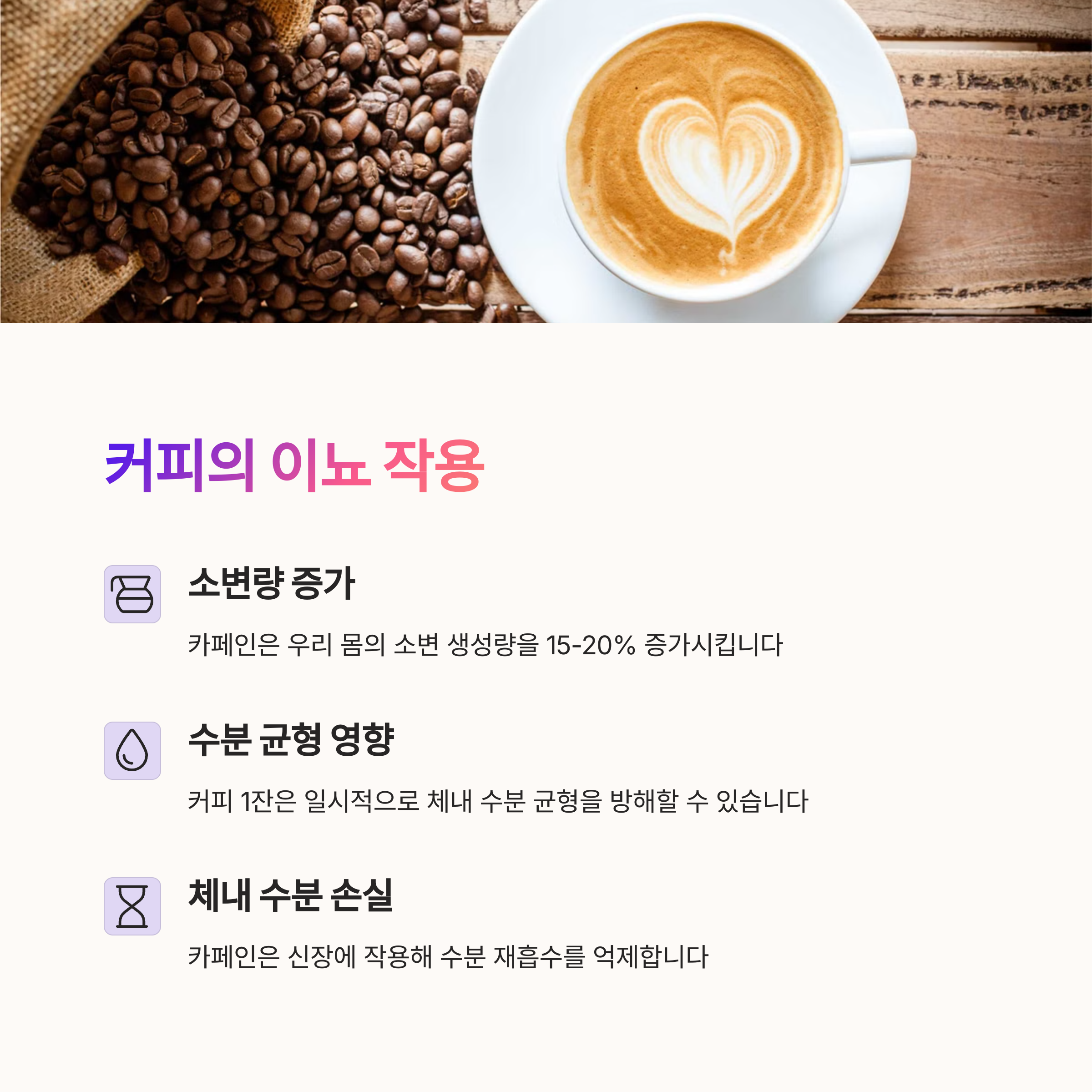 | 커피도 수분이지만 물보다 효과는 낮습니다. | 카페인은 소변 배출을 증가시킬 수 있습니다. | 성인 기준 1.5~2L의 물 섭취가 적절합니다. |