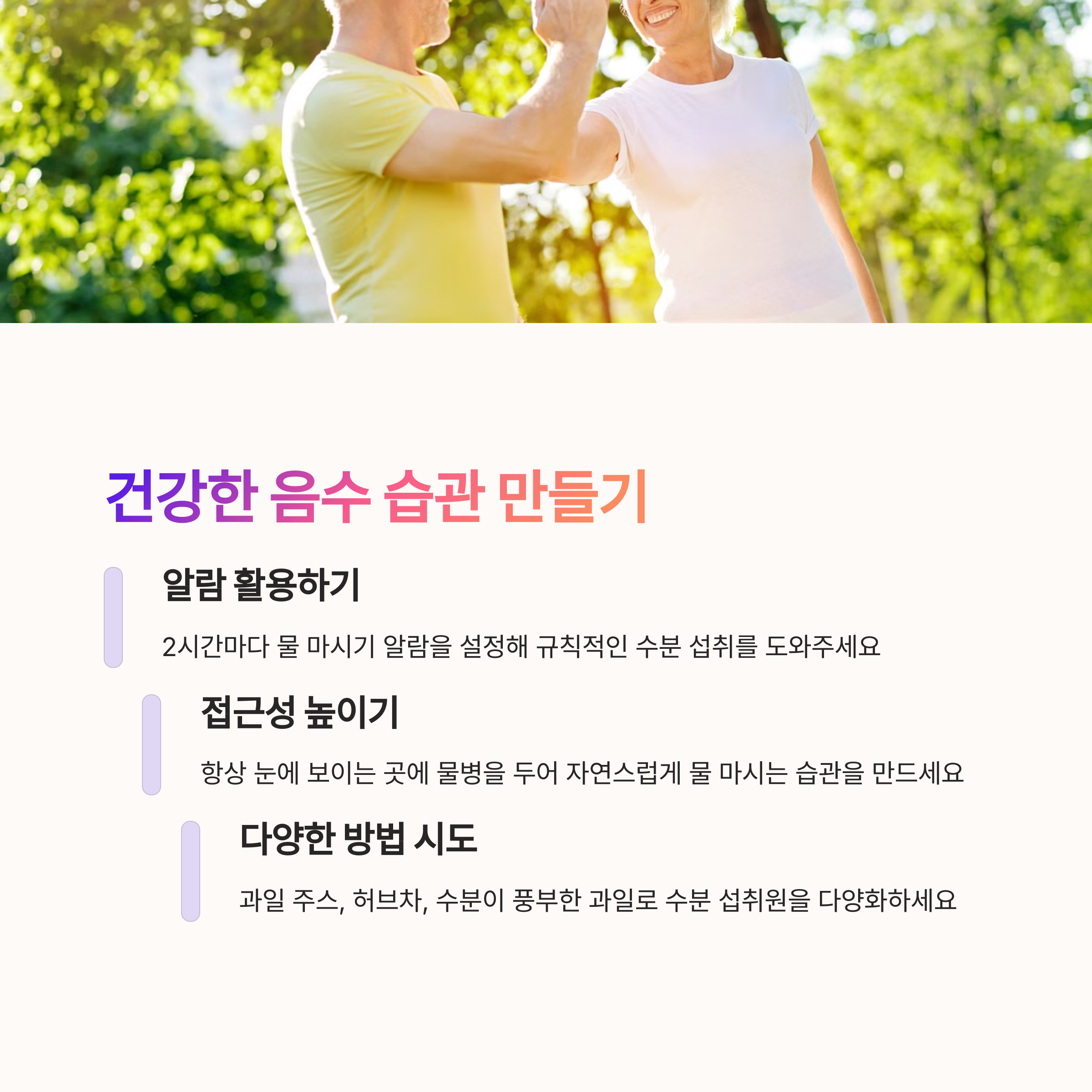 | 갈증 해소보단 기호 음료로 생각해야 합니다. | 물 부족시 탈수 증상이 나타날 수 있어요. | 물병을 가까이 두고 자주 마시는 것이 좋아요. |