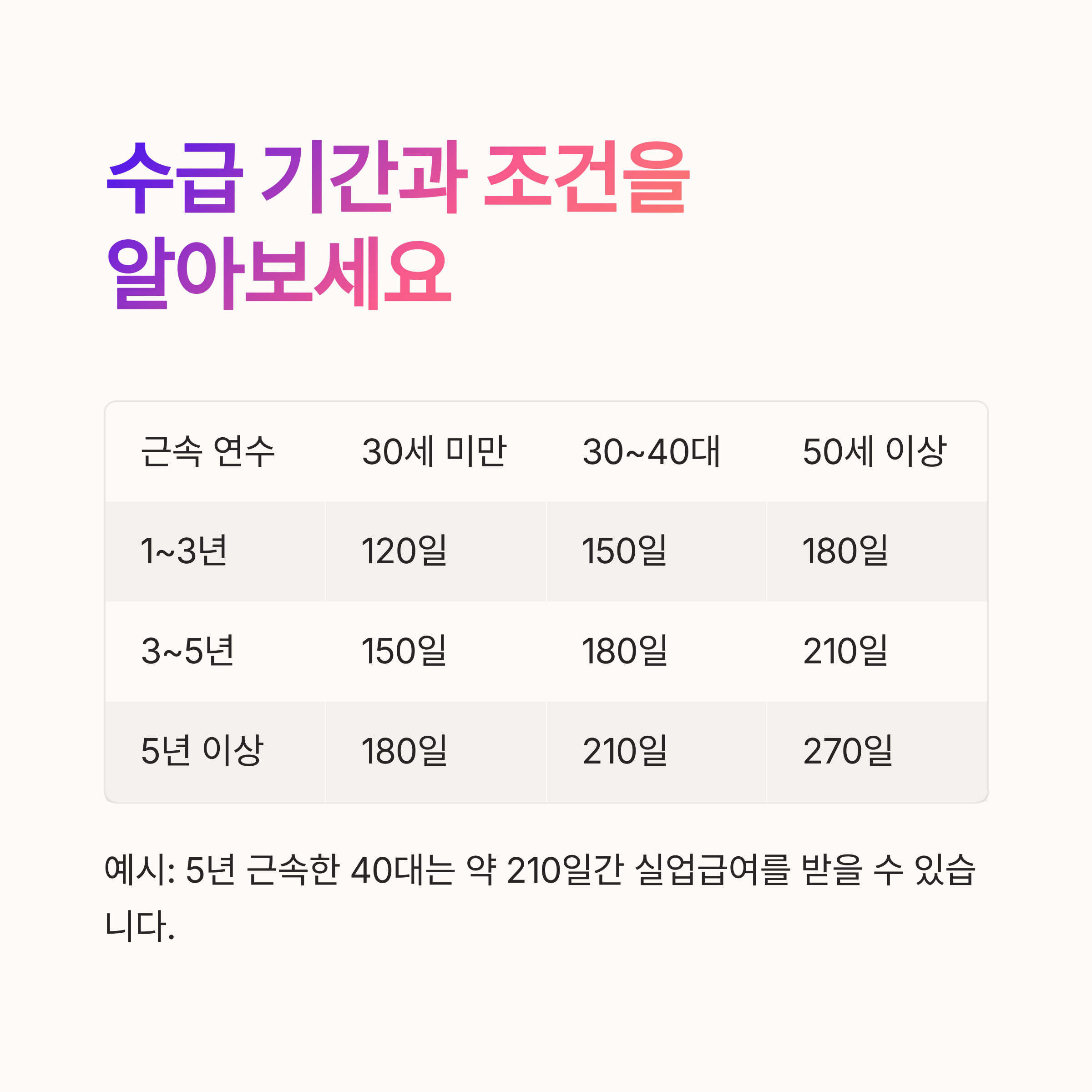 | 수급 가능 기간 | 최소 120일 ~ 최대 270일 (근속 연수별 상이) |