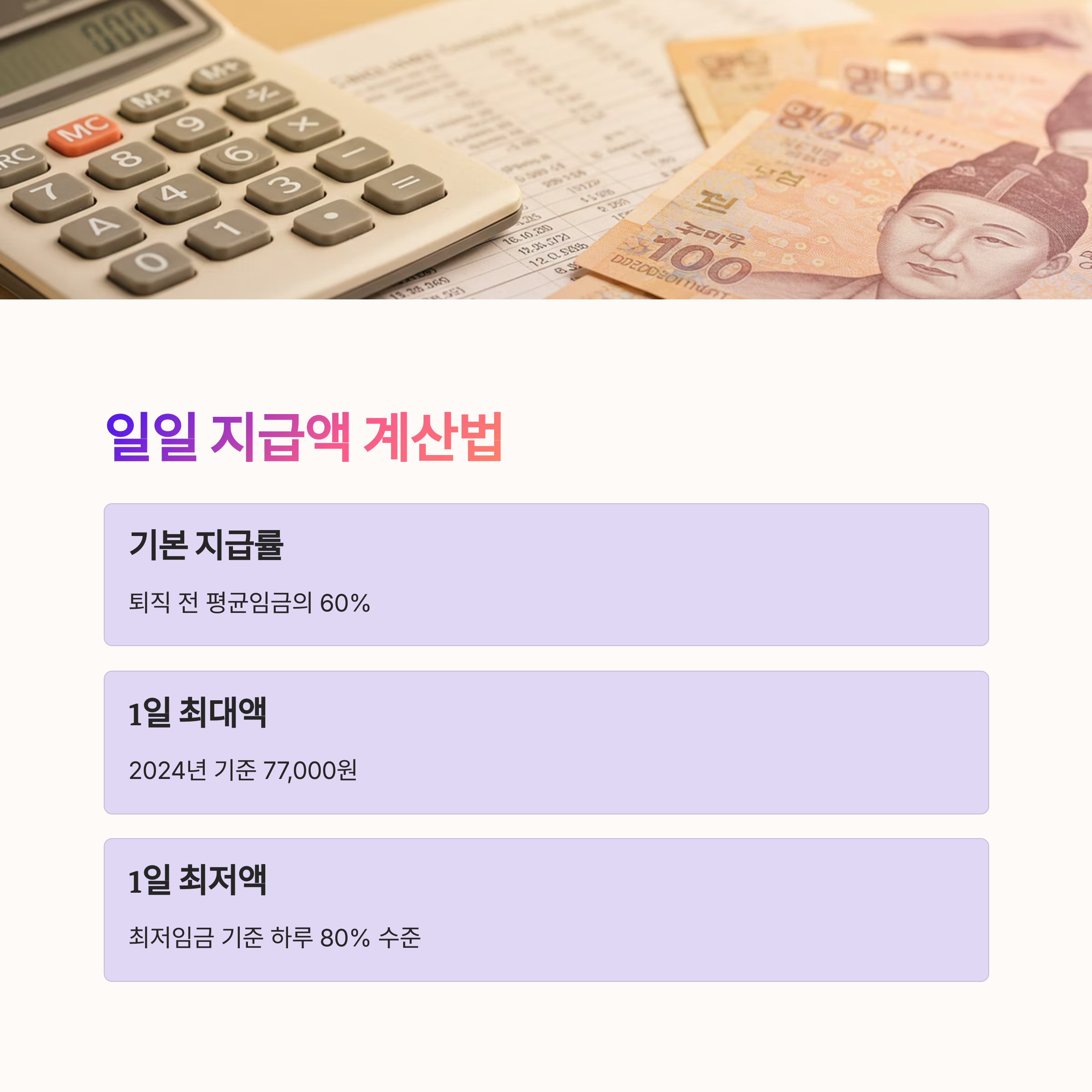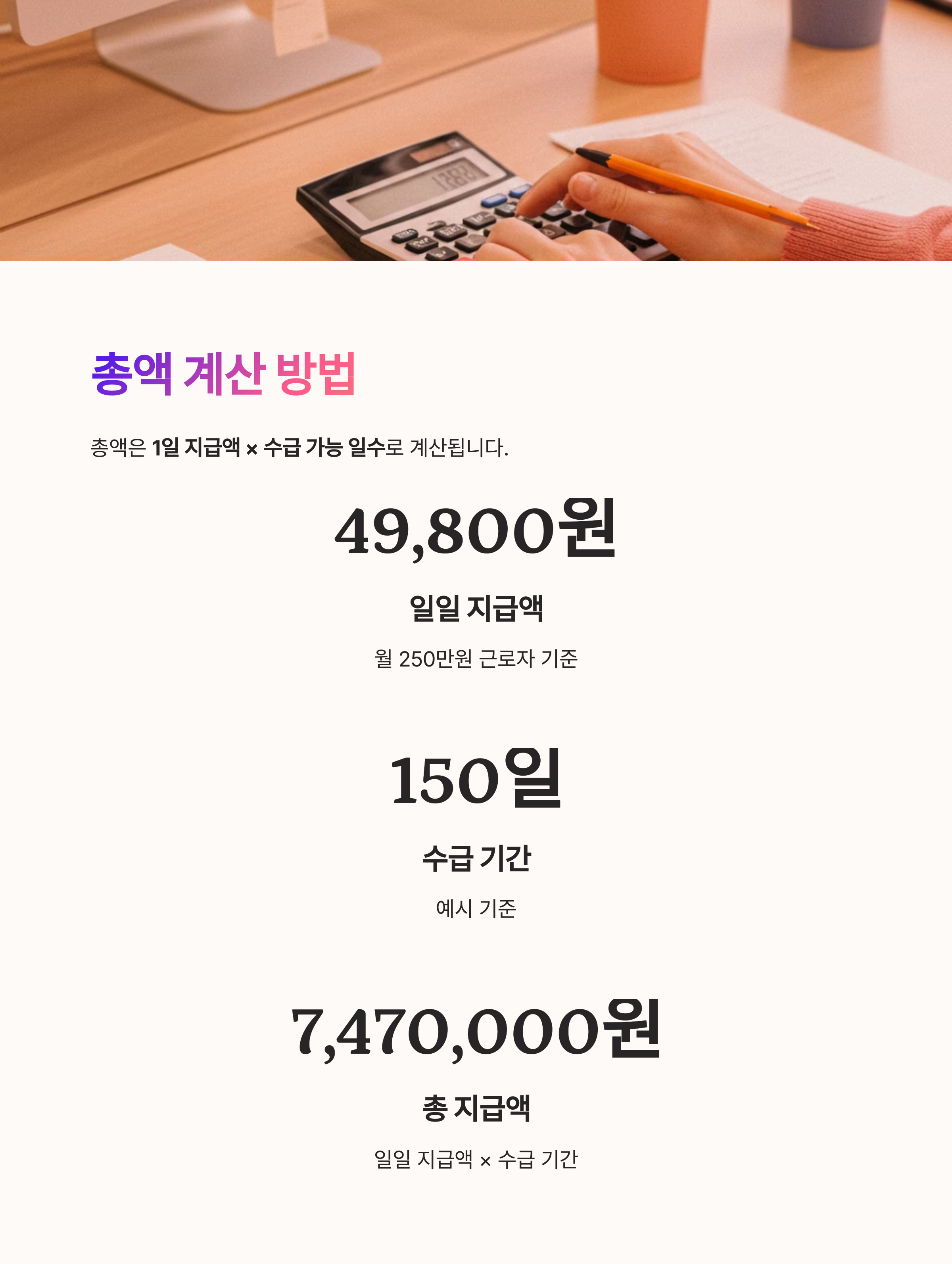 총액은 1일 지급액 × 수급 가능 일수로 계산됩니다.
