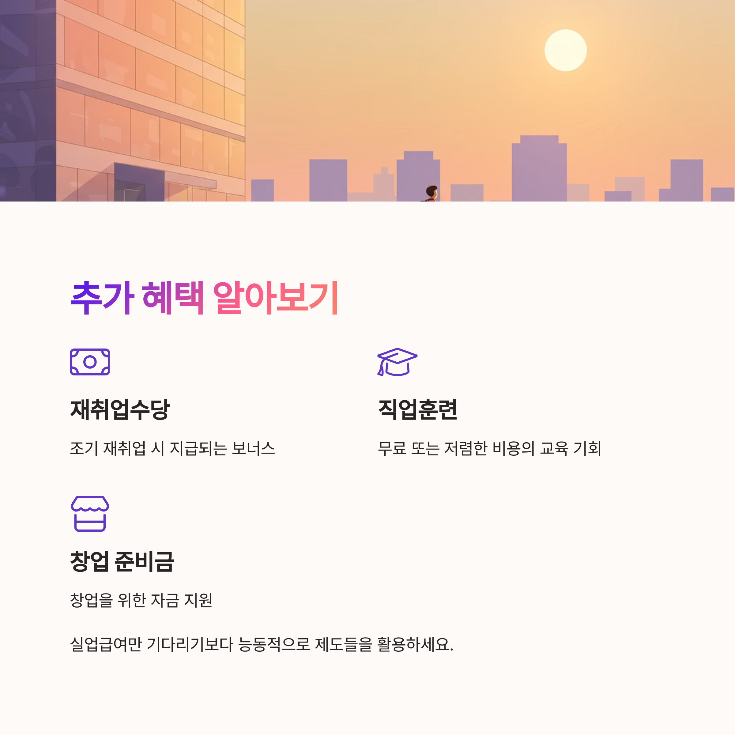 재취업수당, 직업훈련 수강 지원, 창업 준비금 등이 대표적입니다.