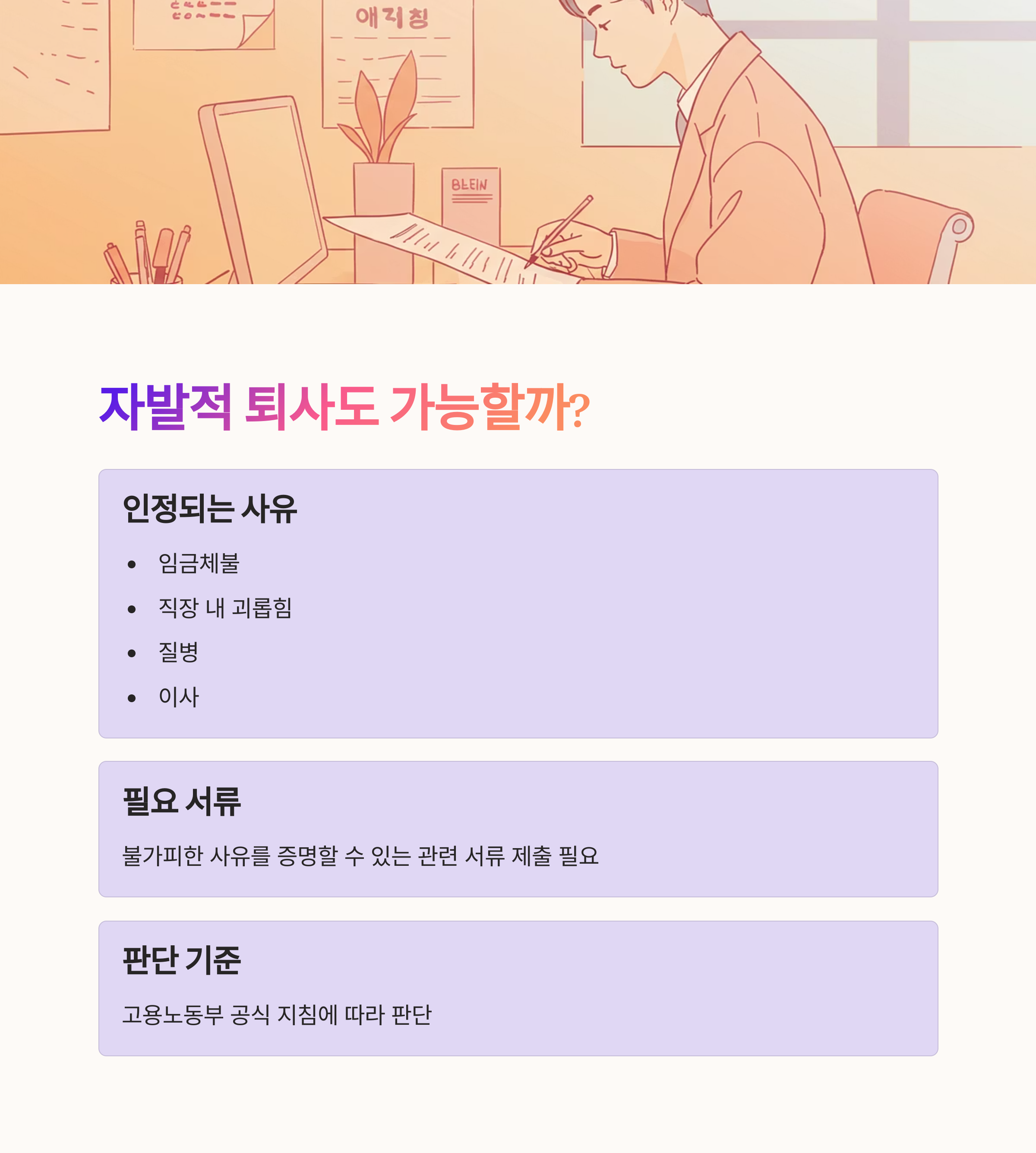 자발적 퇴사는 원칙적으로 실업급여 대상이 아니지만, 일부 예외 사유는 인정됩니다.