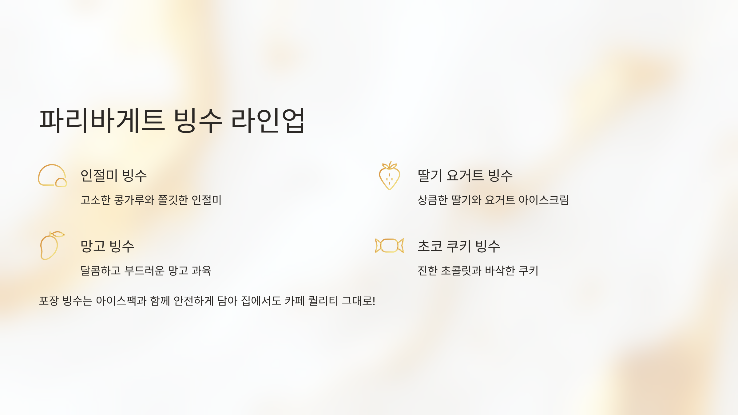 특히 포장 빙수는 아이스팩과 함께 안전하게 담아주기 때문에 집에서도 카페 퀄리티 그대로 즐길 수 있습니다.