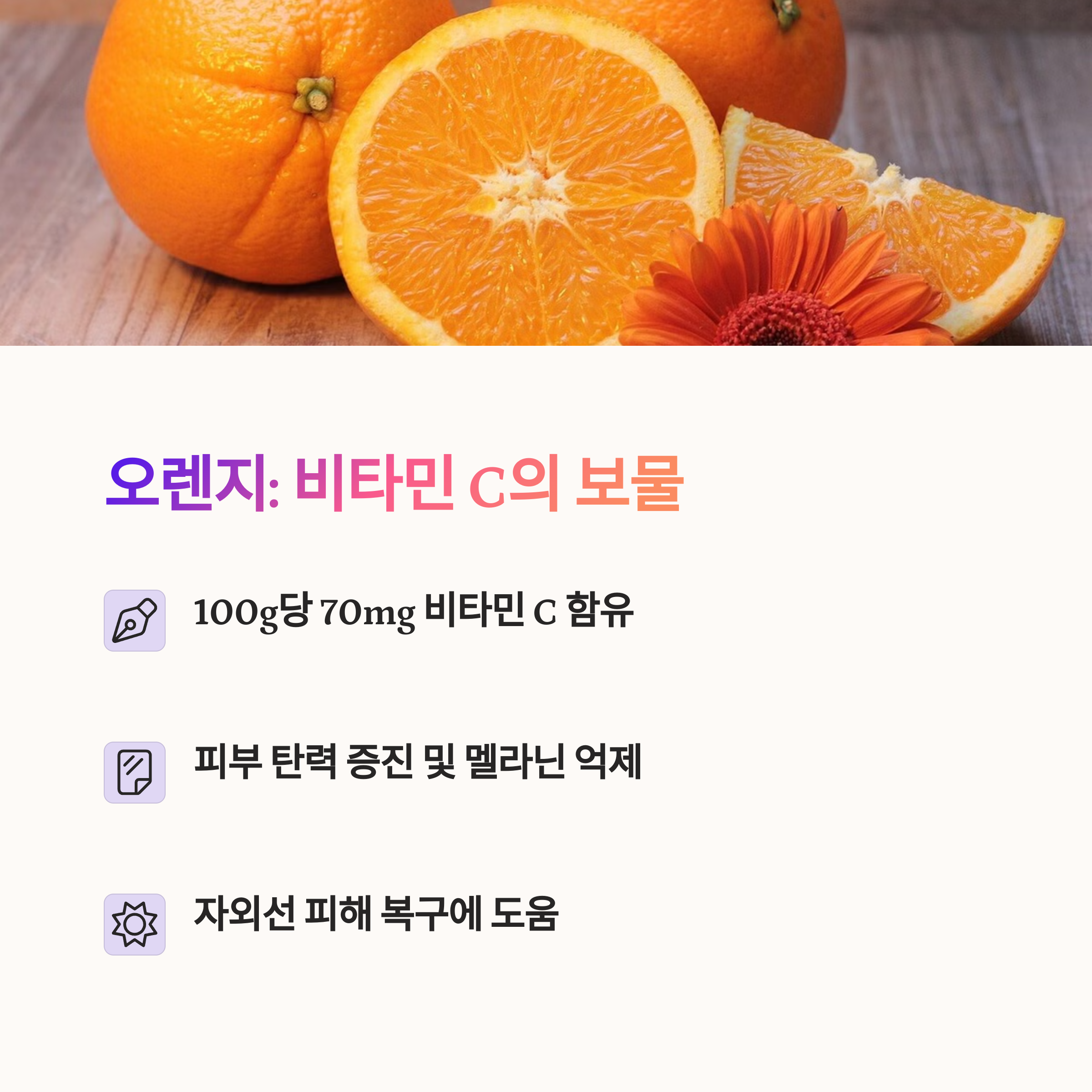 | 비타민C | 피부 탄력을 높이고 색소침착을 예방합니다. |