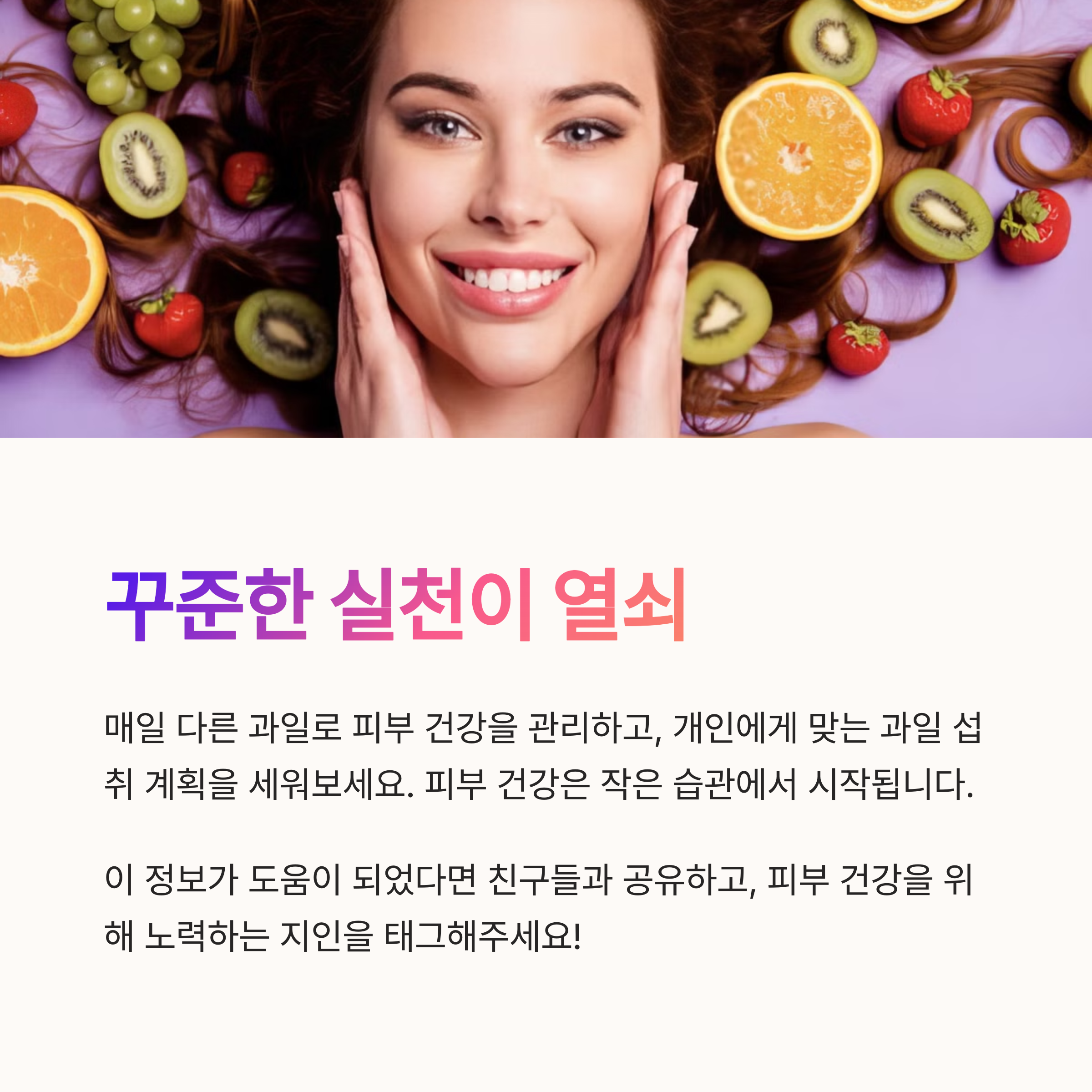건강한 피부는 단기간에 만들어지지 않습니다. 꾸준한 생활습관과 영양소 섭취가 중요하며, 특히 과일은 피부 탄력, 보습, 투명도 등 여러 측면에서 긍정적인 영향을 미칩니다. 오늘 소개한 과일들을 식단에 꾸준히 포함시킨다면 피부 컨디션이 눈에 띄게 개선될 수 있으며, 더불어 면역력과 체력까지 함께 챙길 수 있습니다. 매일 한두 가지의 과일을 즐기며 건강한 피부 여정을 시작해보세요.