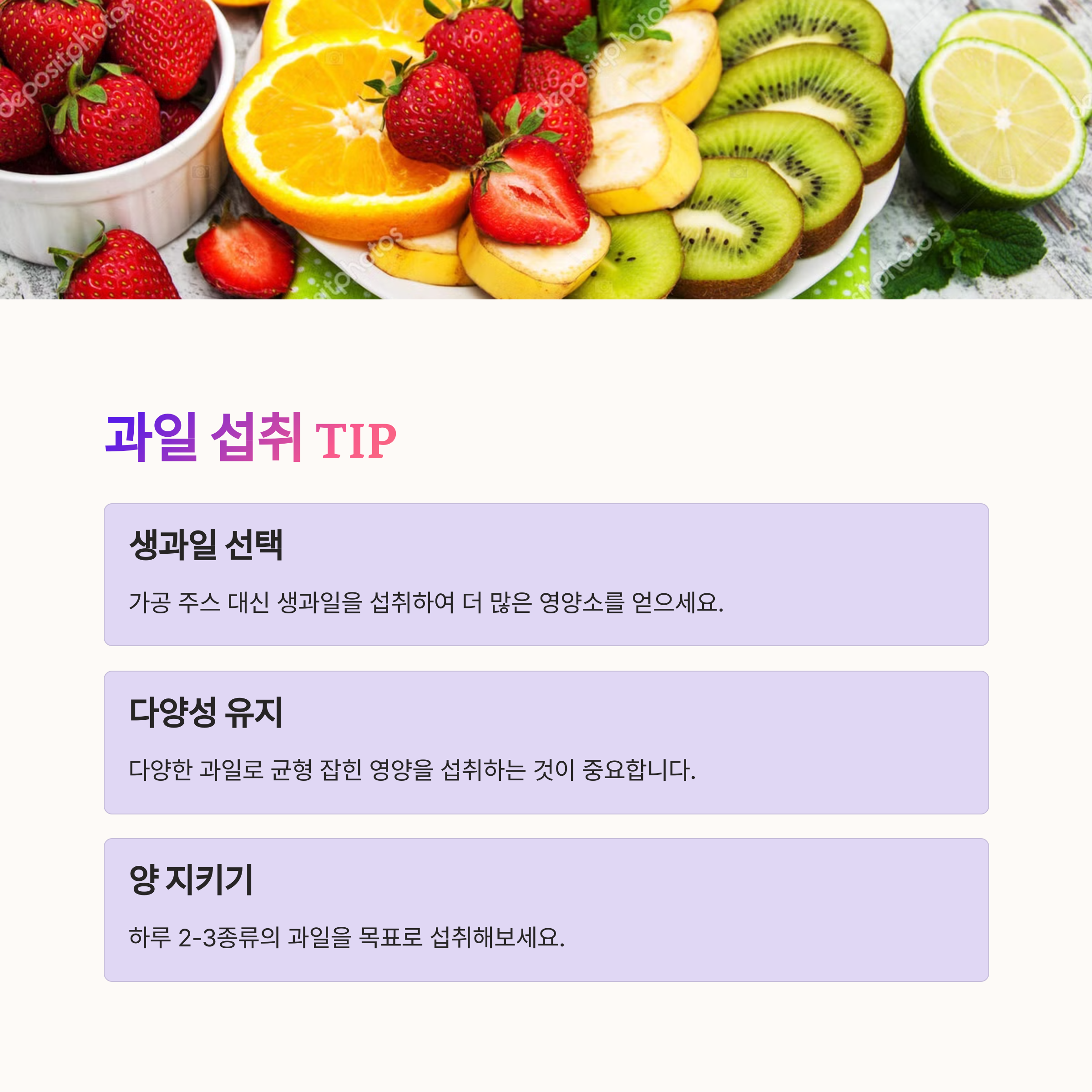 | 블루베리, 석류, 포도 등 추천 | 오렌지, 키위, 파인애플 섭취법 | 수박, 아보카도, 파파야 추천 |