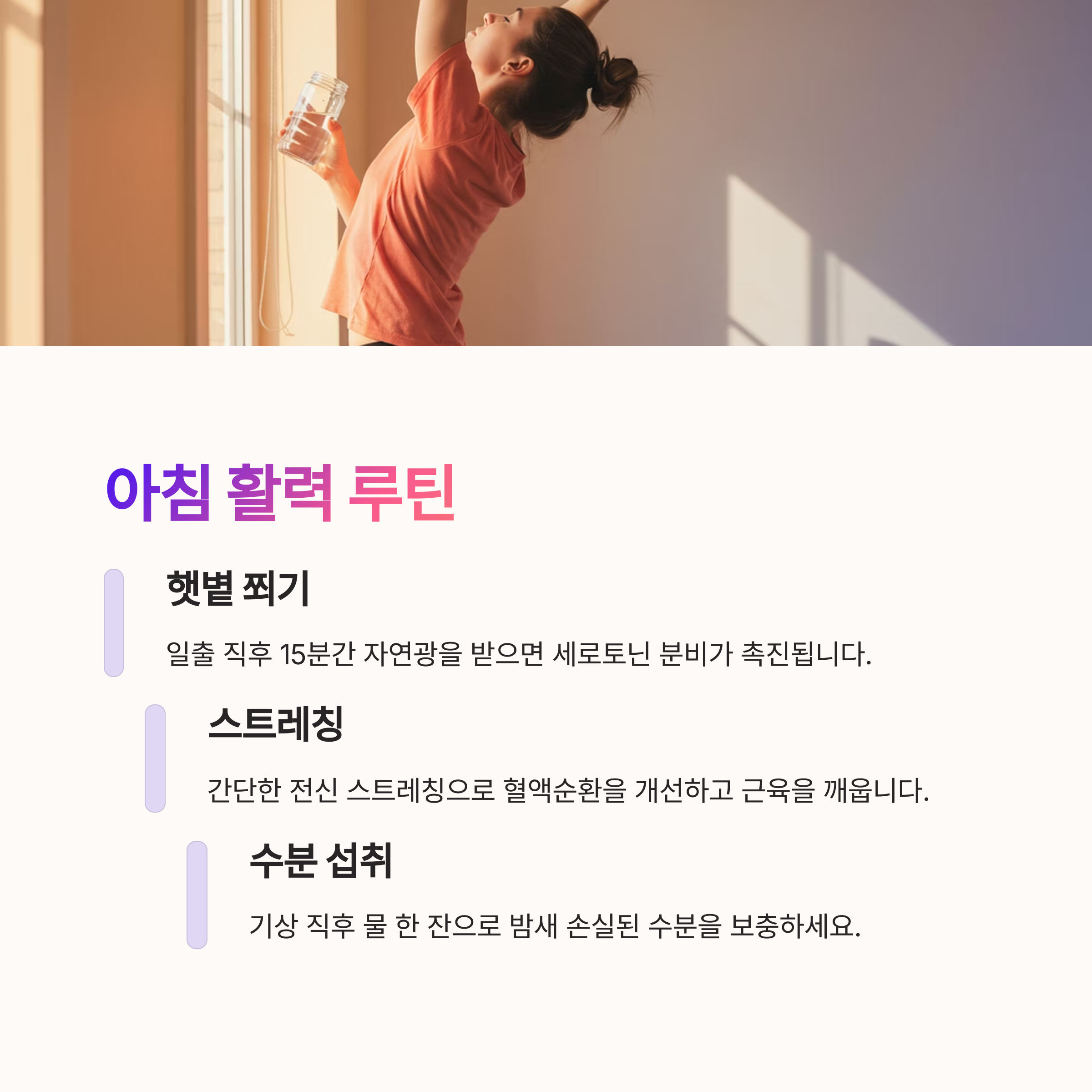| 일정한 생활 습관은 생체 리듬을 안정시킵니다. | 간단한 스트레칭은 나른함을 해소하는 데 효과적입니다. | 하루 1.5~2L의 수분 섭취는 에너지 유지에 필수입니다. |