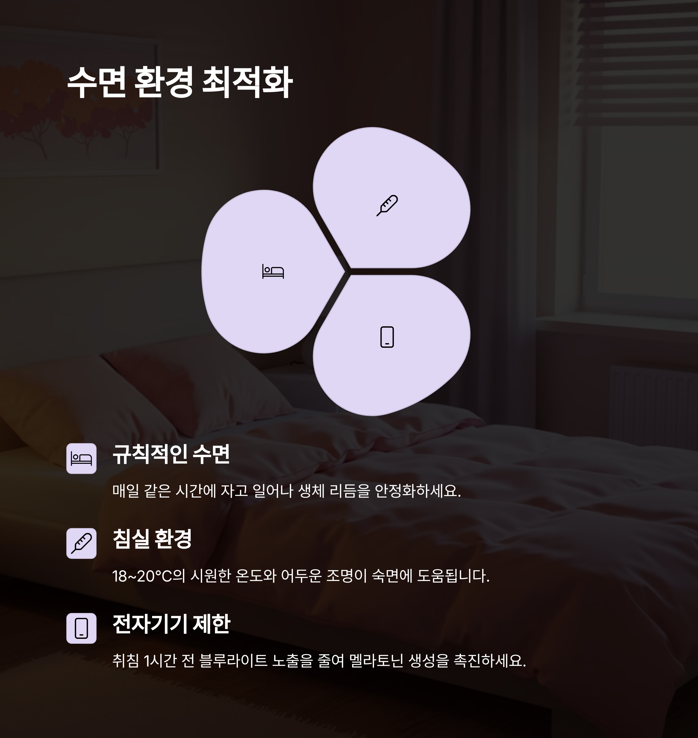 | 기상 시간과 수면 시간을 일정하게 유지하세요. | 점심 후 가벼운 체조나 산책을 추천합니다. | 특히 카페인 대신 따뜻한 물을 섭취해 보세요. |