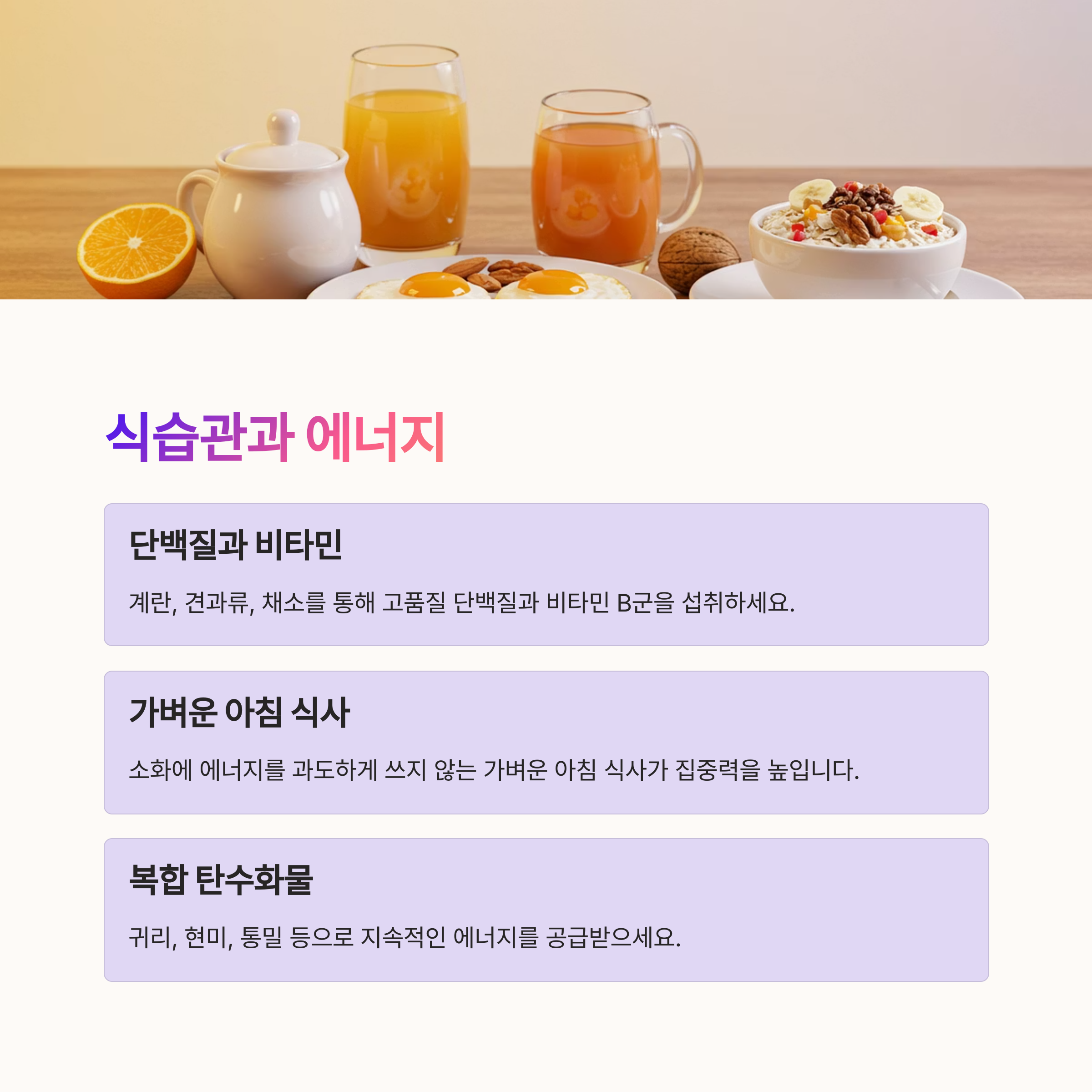 | 루틴의 효과 | 꾸준한 루틴 실천은 집중력과 에너지 향상에 도움을 줍니다. |
