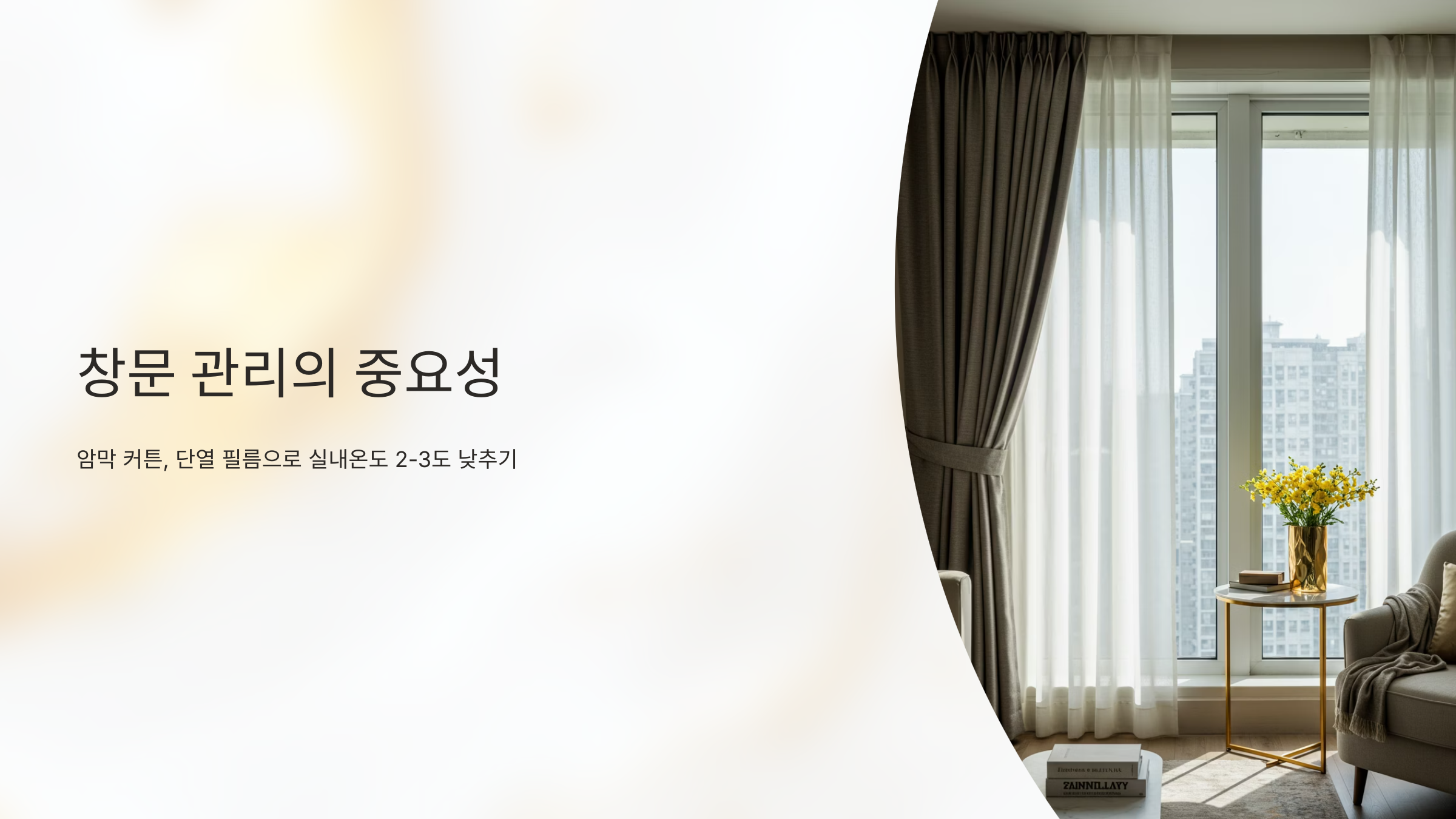 2~3도 낮아질 수 있습니다. 암막 커튼, 단열 필름, 블라인드 등을 활용해
