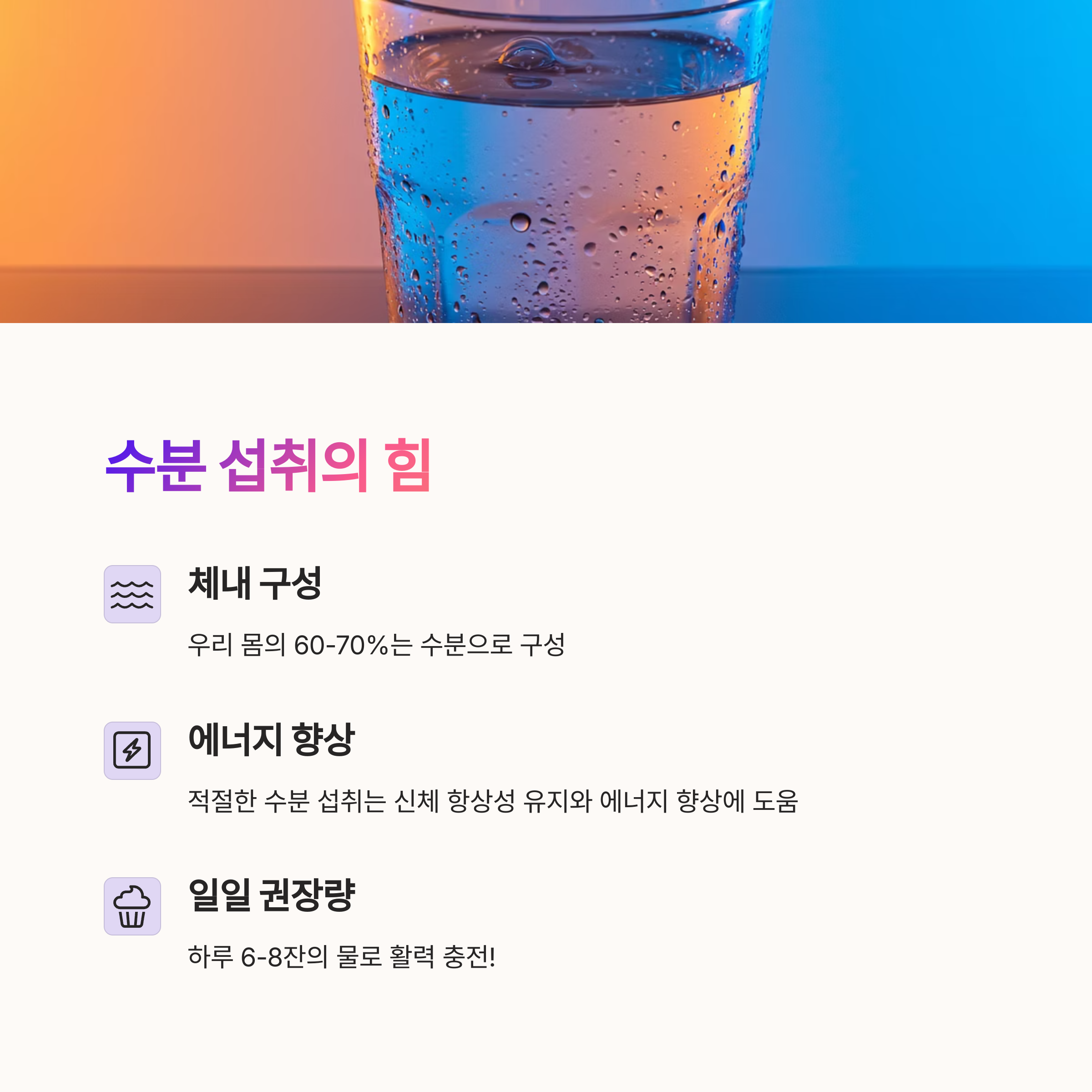 | 하루 2회 5분씩, 전신을 이완하는 동작을 추천합니다. | 물 한잔으로 뇌에 산소와 에너지를 공급할 수 있어요. | 7시간 이상의 깊은 잠은 피로회복의 핵심입니다. |