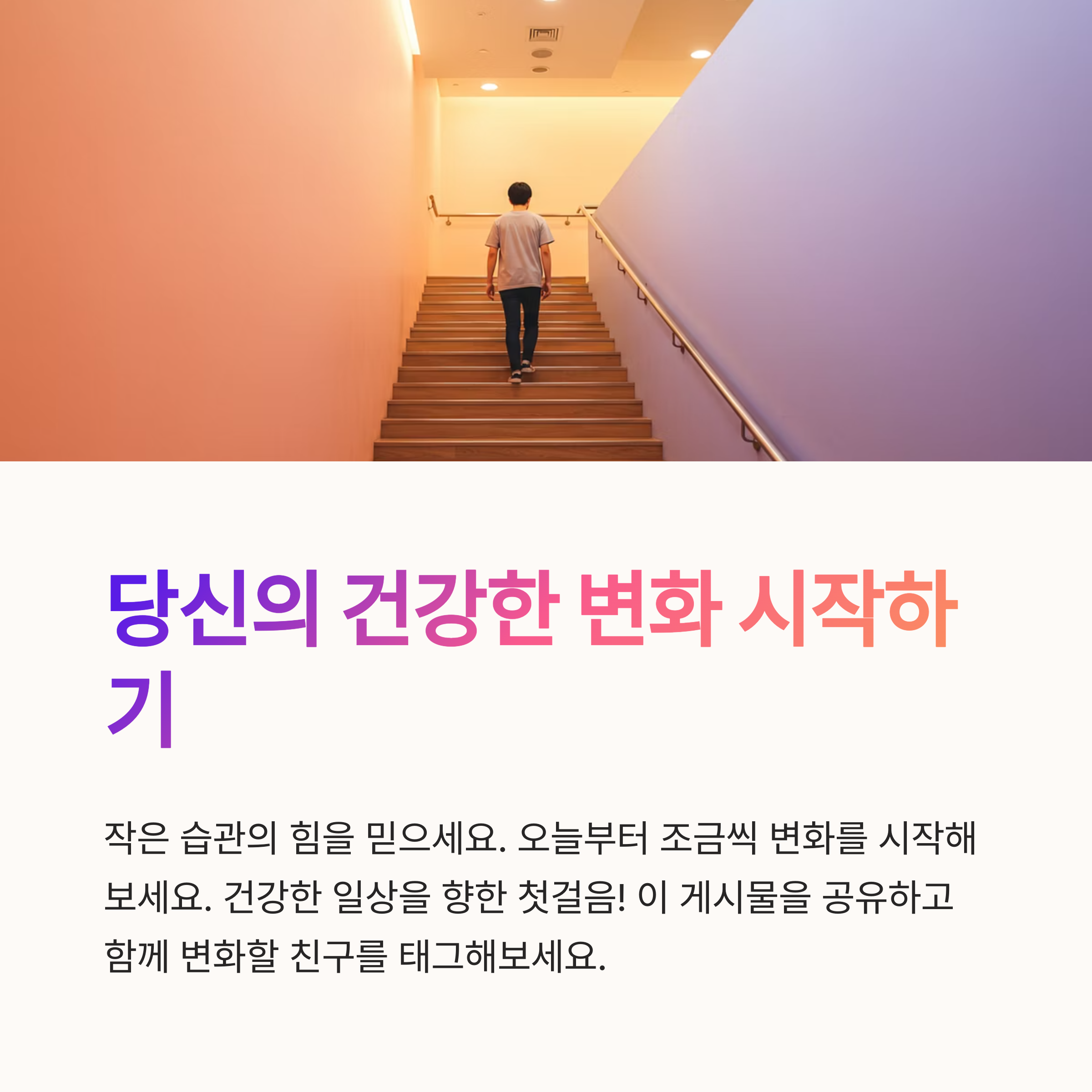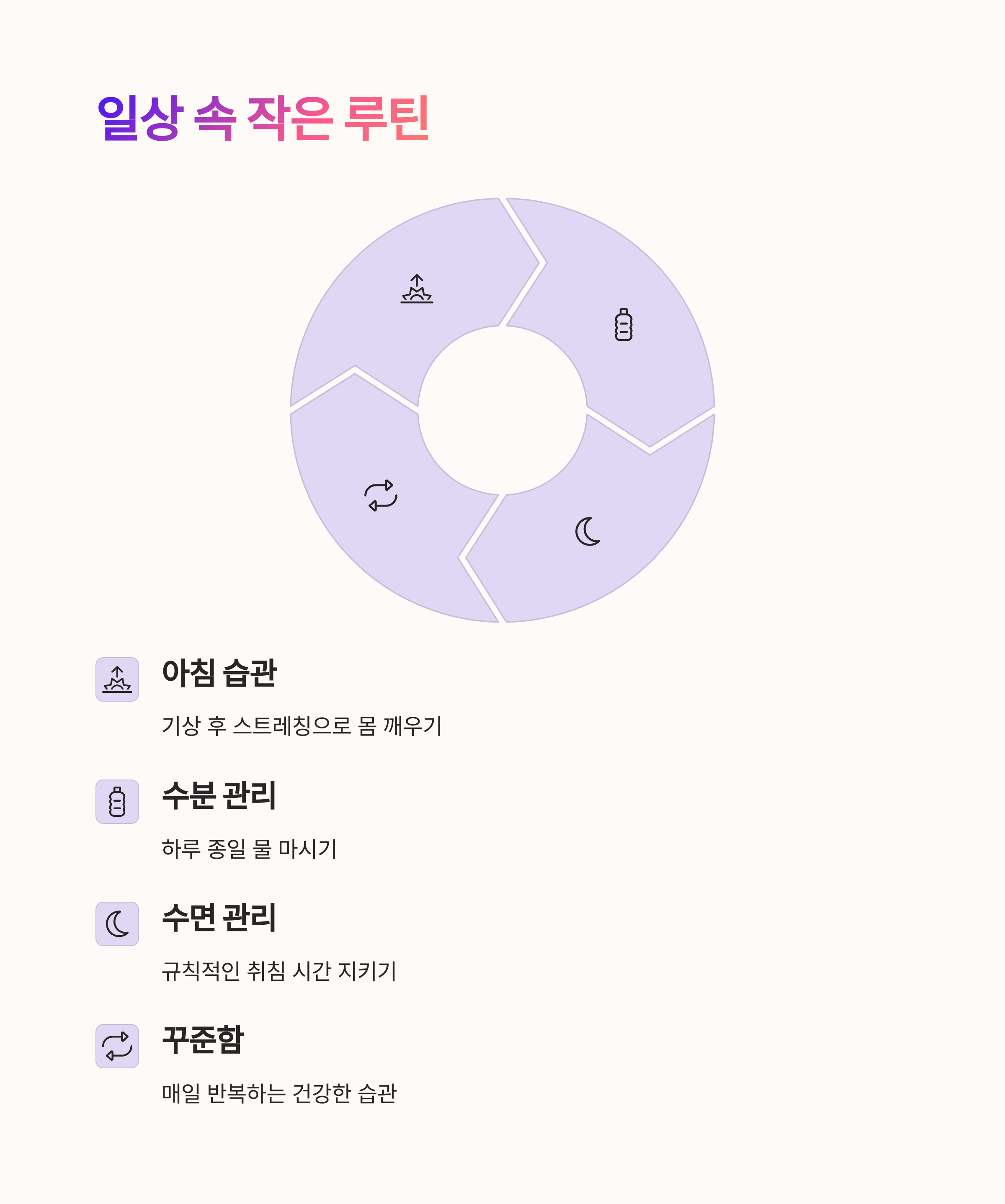| 스트레칭 영상 활용도 좋습니다. | 스마트폰 알림으로 물 마시는 습관 들이세요. | 숙면을 위한 조명과 온도 조절도 중요합니다. |