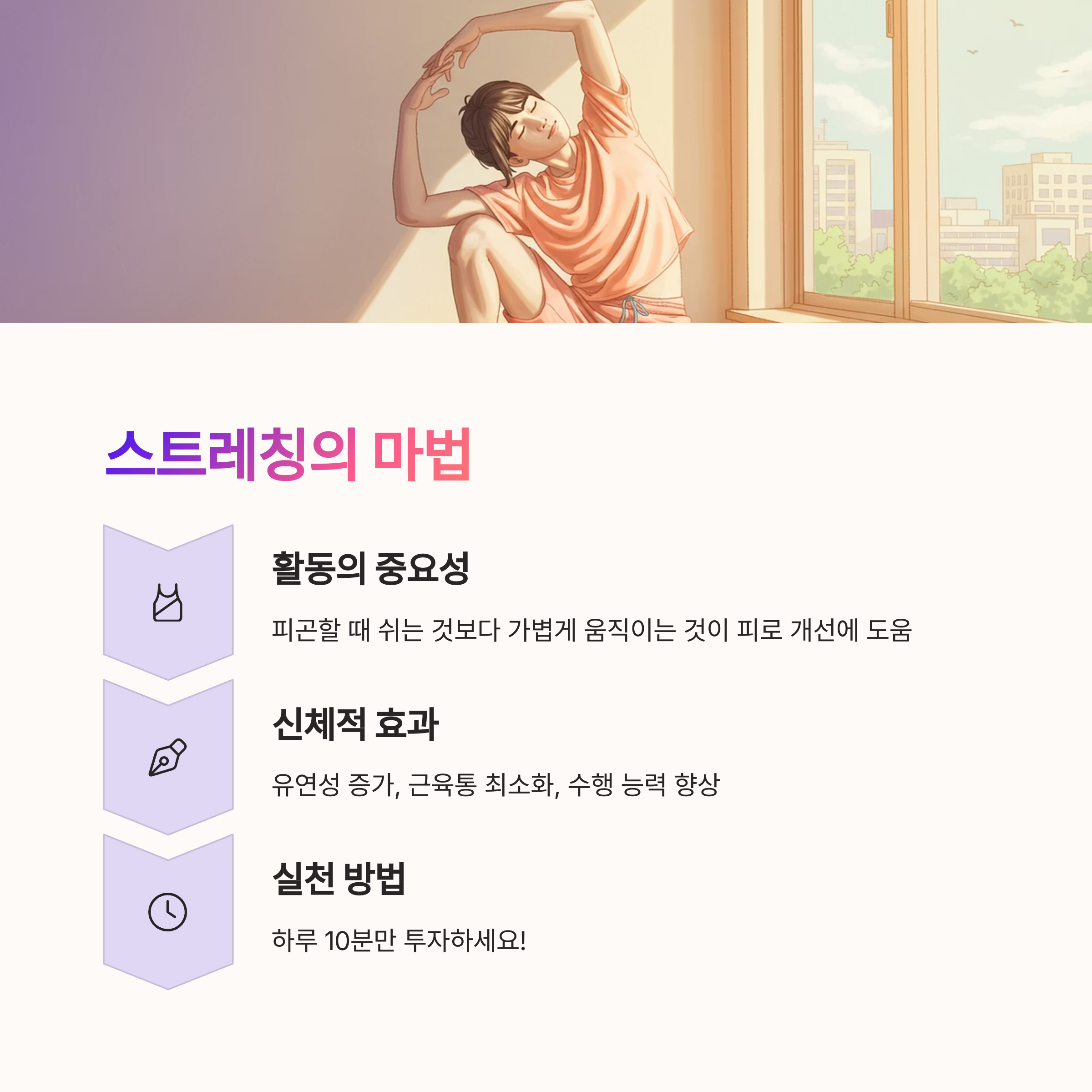 | 피로 해소 스트레칭 | 아침, 점심 5분씩 꾸준히 반복하면 효과적입니다. |