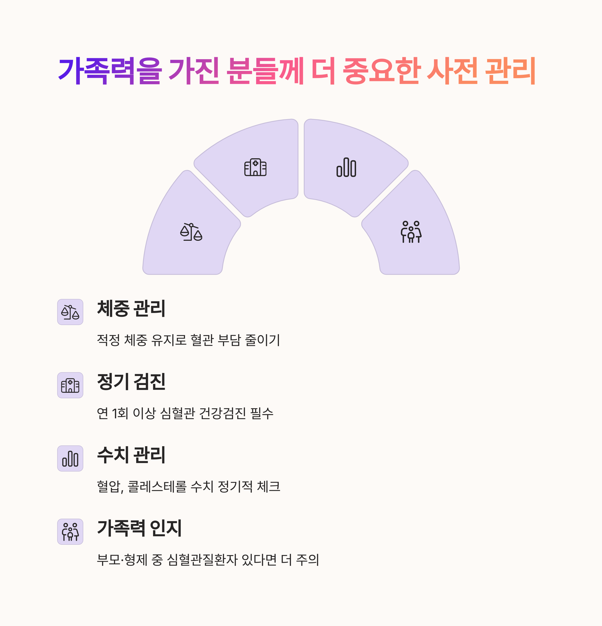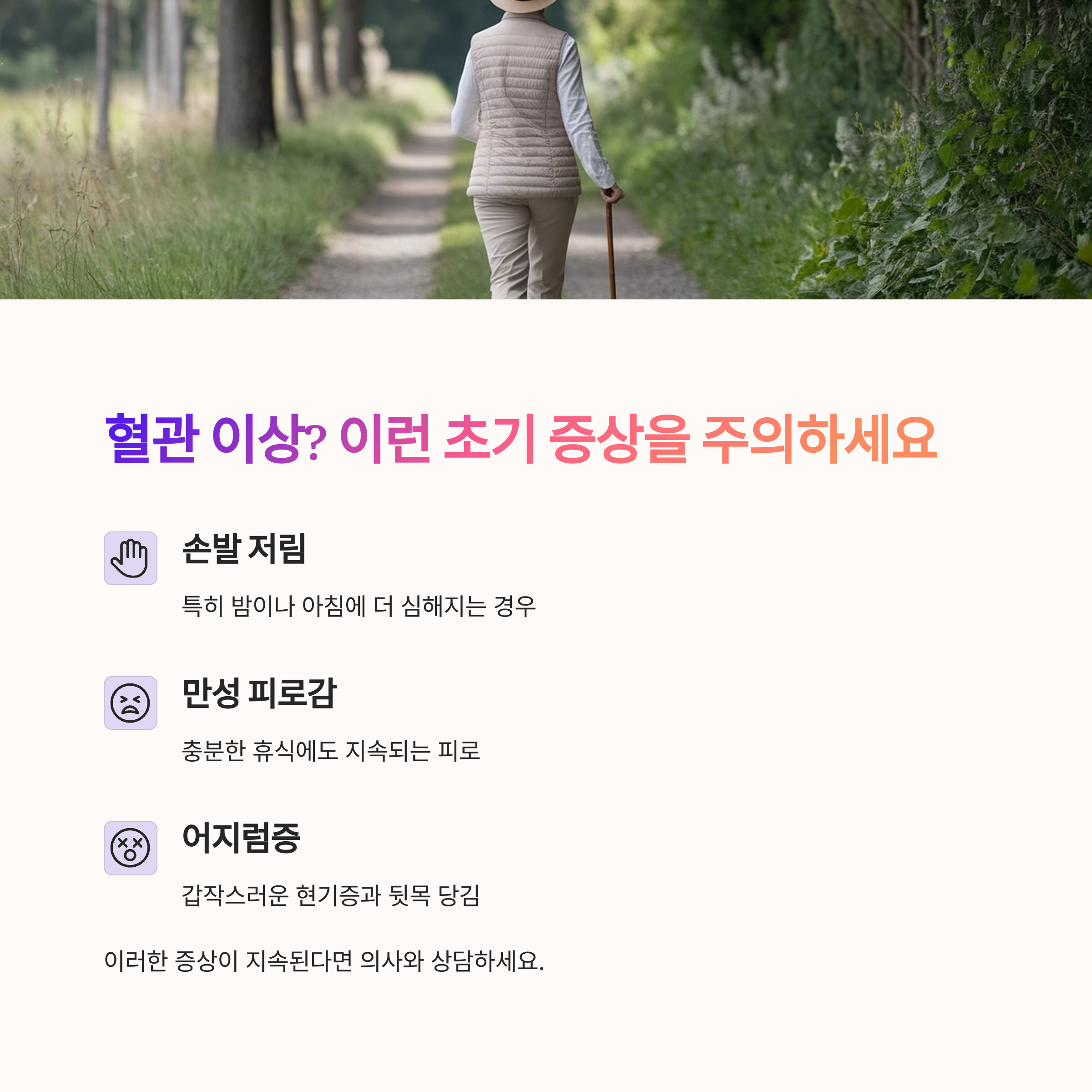 | 손발 저림, 피로, 어지럼증 등이 대표적입니다. | 유산소 운동과 균형 잡힌 식단 유지가 중요합니다. | 가족 병력 있다면 정기검진 필수입니다. |