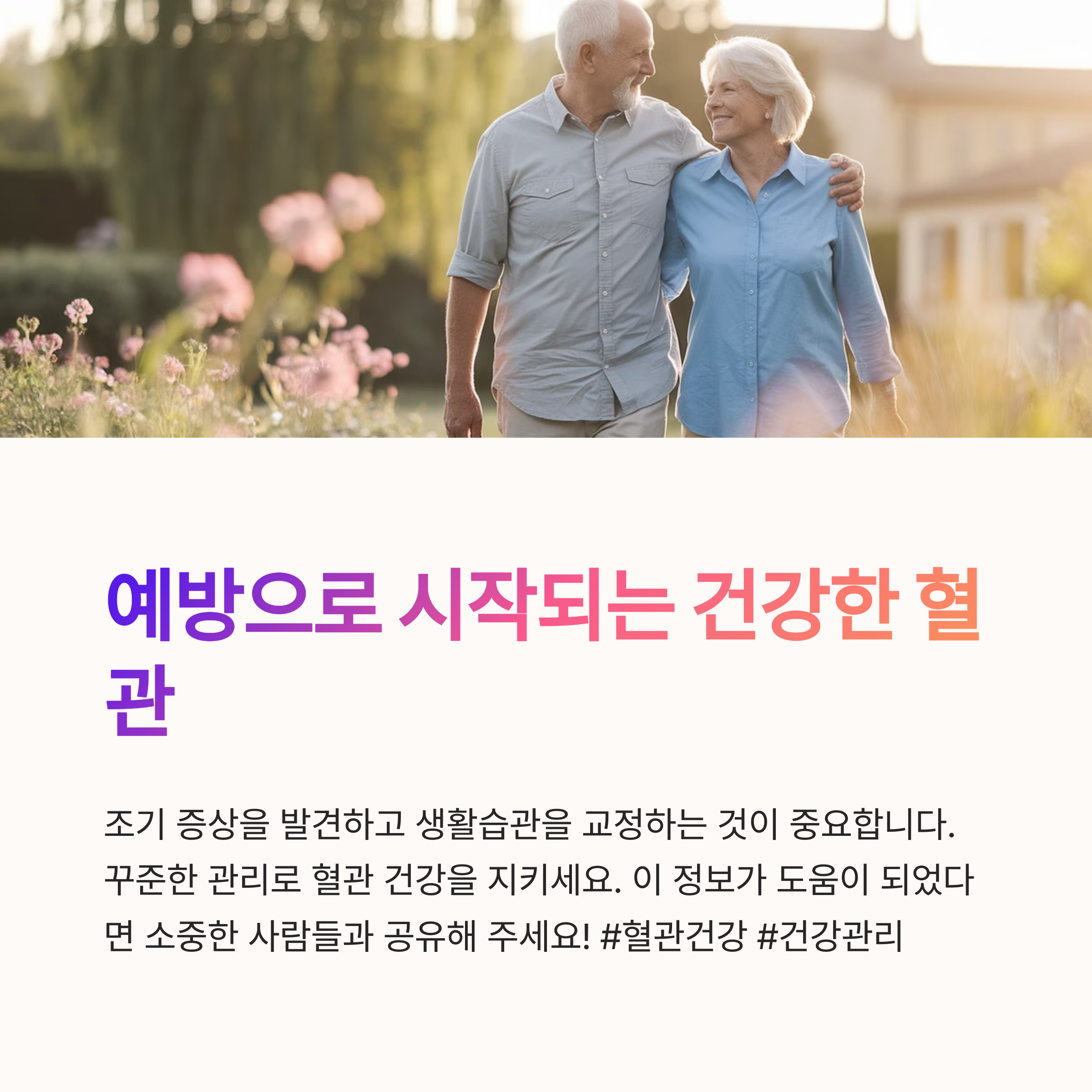 혈관 건강은 단순히 하나의 질환 문제가 아니라 전체적인 삶의 질과 직결되는 중요한 영역입니다. 우리는 매일의 식사, 운동, 스트레스 관리 등 생활 전반을 통해 혈관을 돌보아야 하며, 작은 변화가 큰 결과로 이어질 수 있다는 점을 인식해야 합니다. 특히 증상이 없더라도 정기적인 검진을 통해 조기 발견과 예방을 실천하는 것이 무엇보다 중요합니다. 건강한 혈관은 곧 활기찬 삶을 가능하게 합니다. 지금부터라도 나의 혈관 상태를 체크하고, 더 나은 건강을 위한 행동을 시작해보세요.
