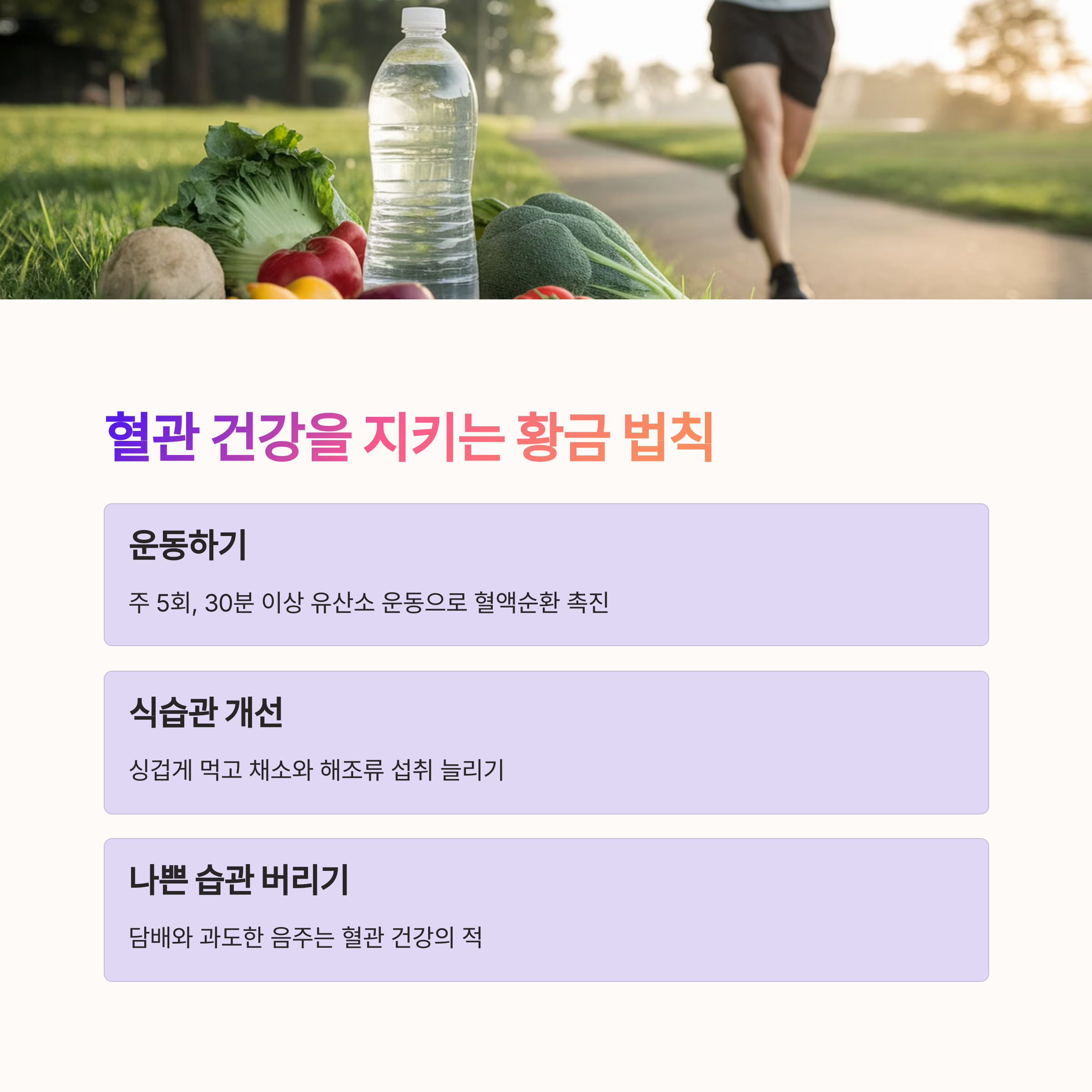 대표적인 초기 증상으로는 손발 저림, 자주 피로함, 가슴 통증, 어지럼증 등이 있으며 이를 단순한 증상으로 넘기면 안 됩니다. 이러한 신호는 우리 몸이 보내는 경고일 수 있습니다. 정기적인 혈압 측정과 혈액 검사, 그리고 생활 습관 개선이 혈관 건강을 지키는 첫걸음입니다. 아울러 유산소 운동과 채소 중심의 식단은 혈관의 탄력과 청결함을 유지하는 데 매우 큰 도움이 됩니다. 특히, 꾸준함이 가장 중요하다는 점을 기억하세요.