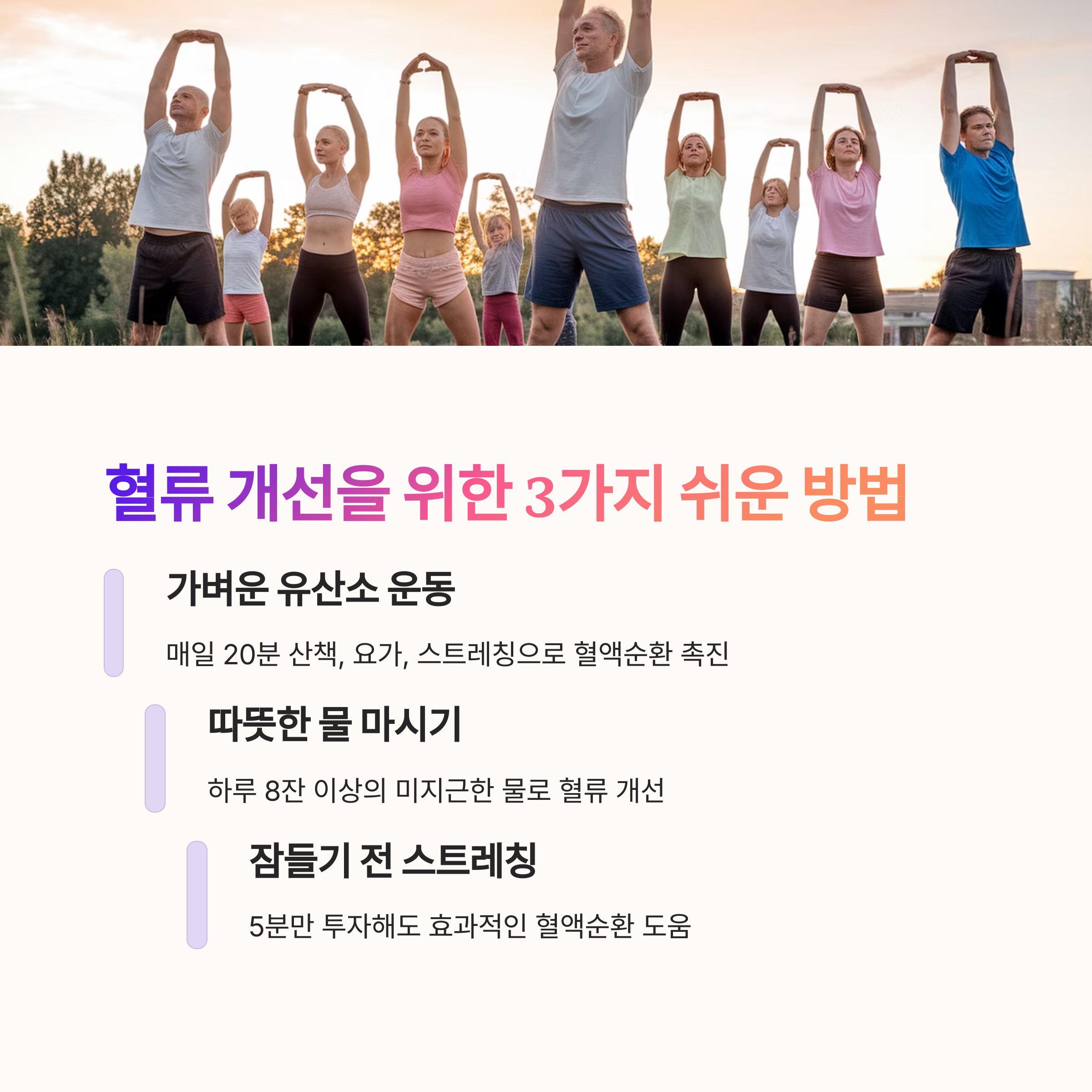 | 스트레스, 운동 부족, 수분 부족 등이 주요 원인입니다. | 꾸준한 운동, 따뜻한 물 섭취, 스트레칭이 효과적입니다. | 하루 10분 산책, 족욕, 다리 올리기 등을 실천해보세요. |