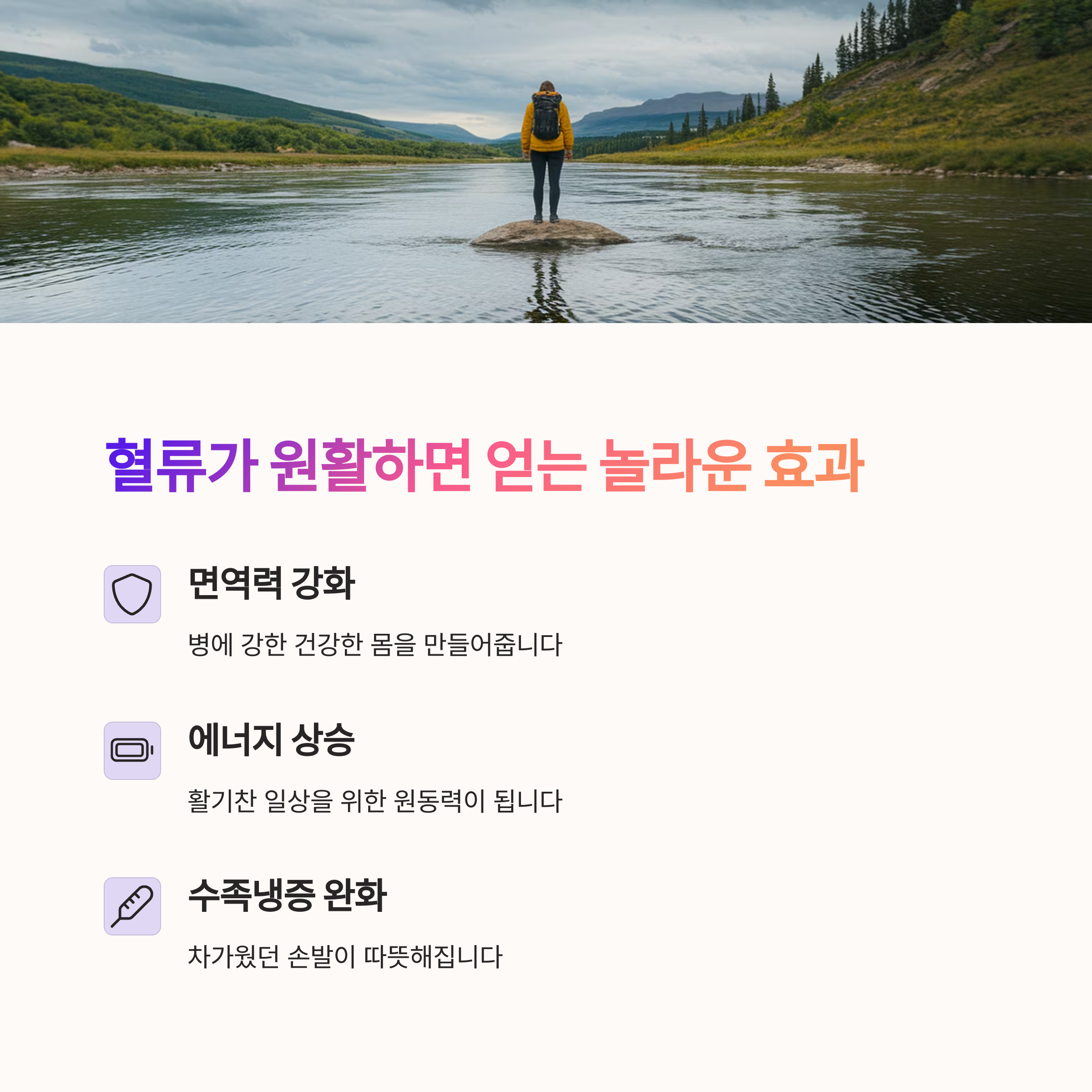 | 혈류 개선 | 혈액이 원활히 흐르면 면역력과 에너지 향상에 도움이 됩니다. |