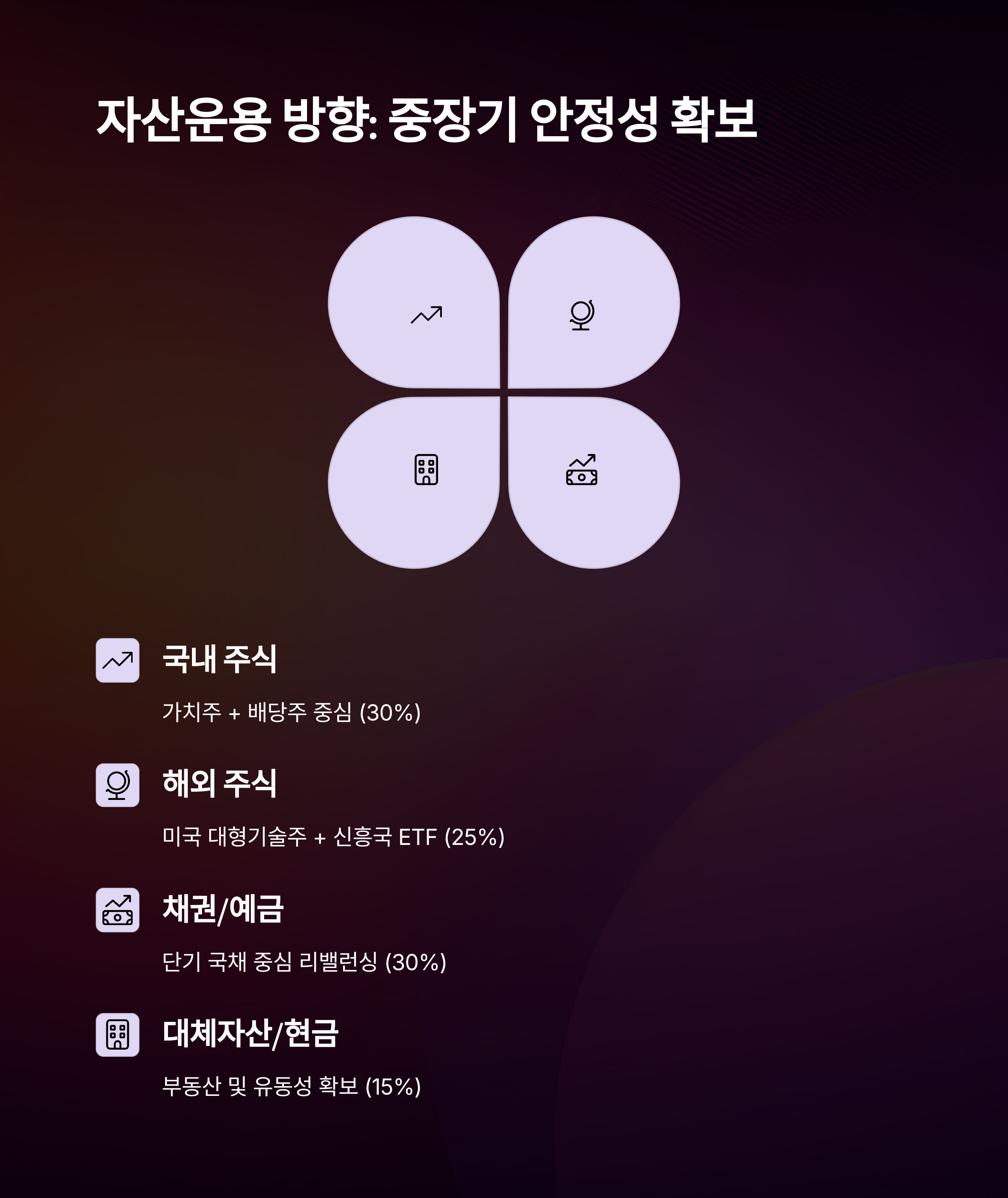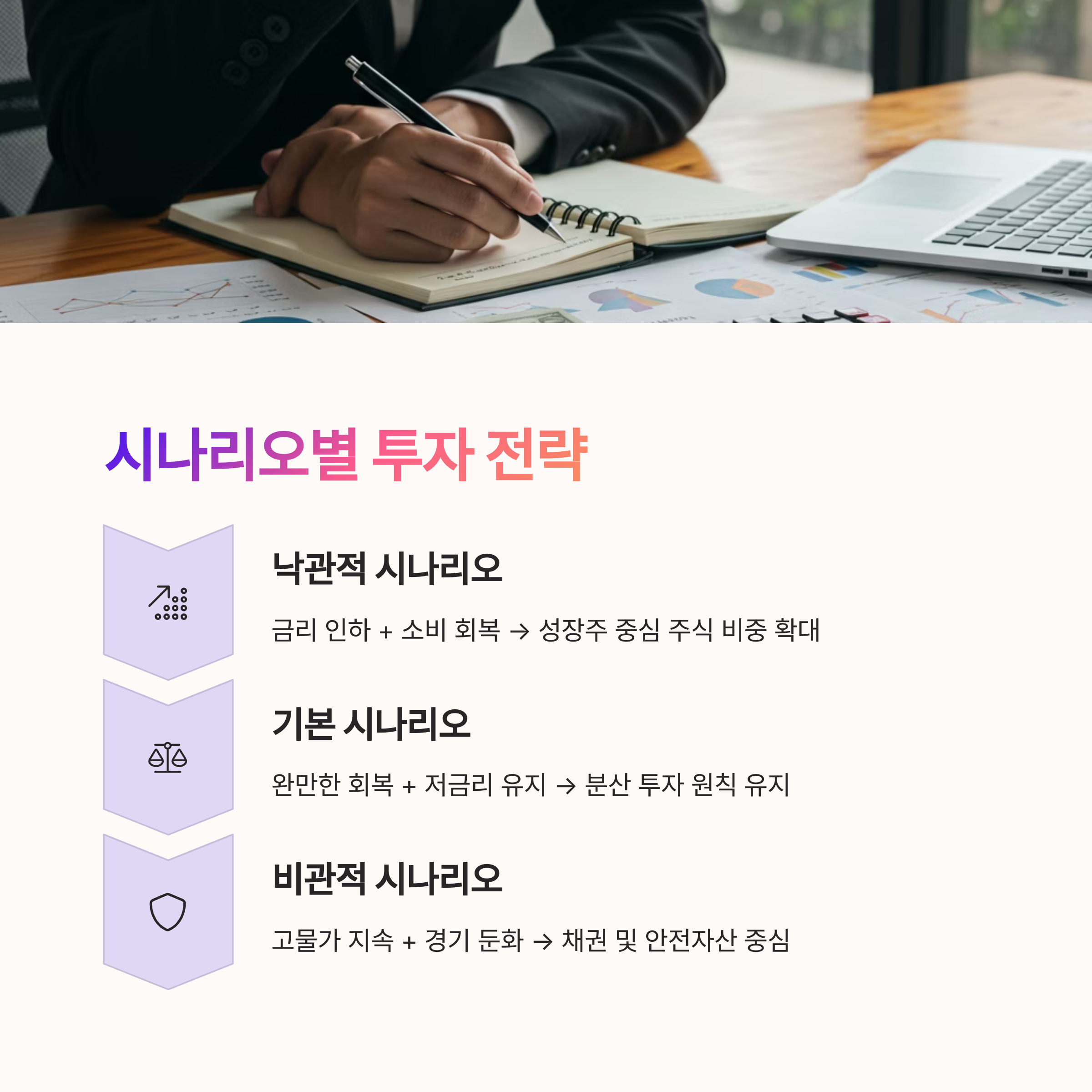 - 시나리오 A (낙관적): 금리 인하 + 소비 회복 → 주식 비중 확대