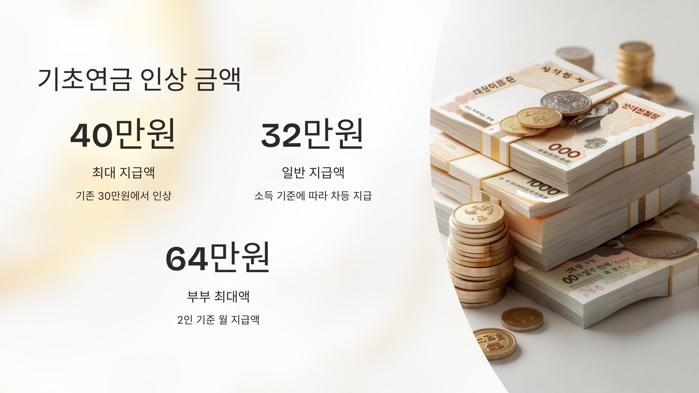 2025년부터 기초연금은 기존 30만 원에서 최대 40만 원까지 인상되었습니다.