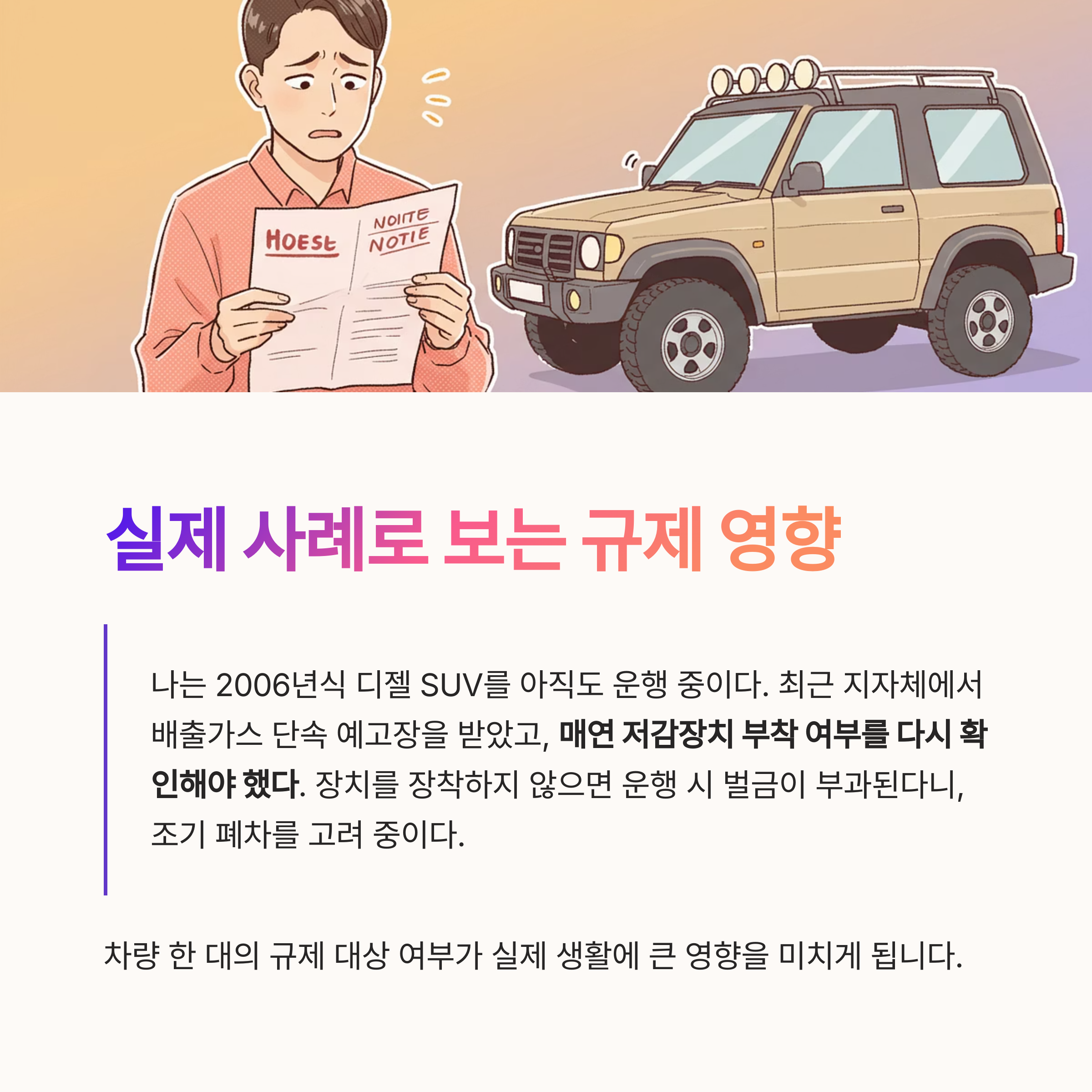 이처럼 차량 한 대의 규제 대상 여부가 실제 생활에 큰 영향을 미치게 됩니다.