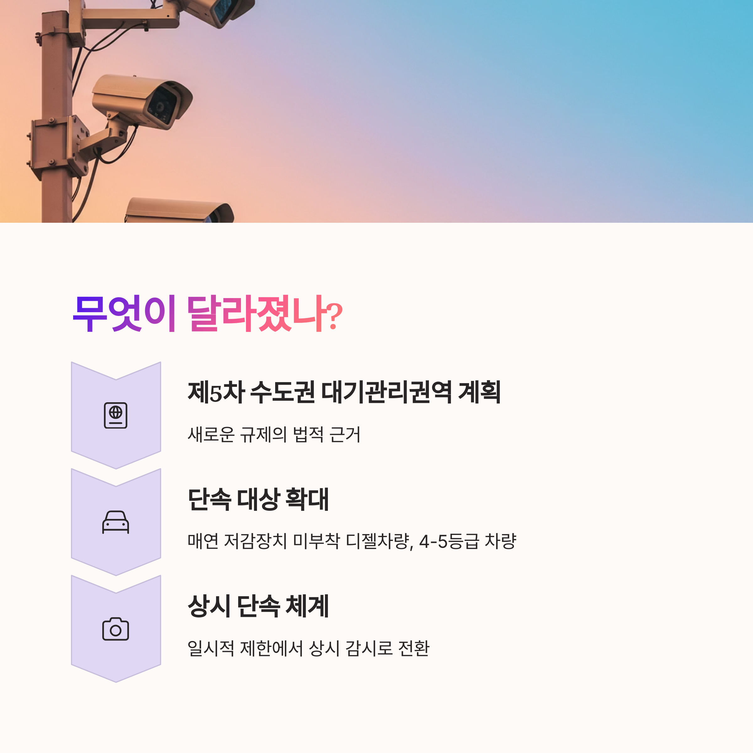 2025년부터 시행되는 강화안의 핵심은 제5차 수도권 대기관리권역 계획에 근거합니다. 이에 따라 매연 저감 장치 미부착 디젤차량과 일정 등급 이하의 노후 차량이 단속 대상이 됩니다.